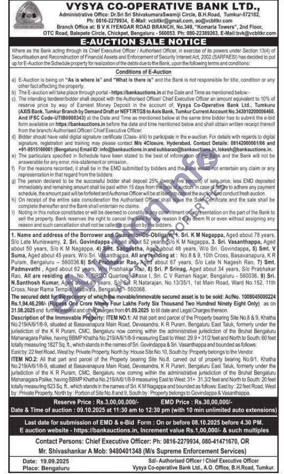 ITEM NO.1: All that part and parcel of the Property bearing Site No.8 & 9, Khatha No.219/A/6/1/8-9, situated at Basavanapura Main Road, Devasandra, KR Puram, Bengaluru East Taluk, formerly under the jurisdiction of the KR Puram, CMC, Bengaluru now coming within the administrative jurisdiction of the Bruhat Bengaluru Mahanagara Palike, having BBMP Khatha No. 219/A/6/1/8-9 measuring East to West: 29.9+31/2 feet and North to South: 60 feet totally measuring 1827 Sq. ft., which stands in the names of Sri. Govindappa & Sri. Vasanthappa and bounded as follows: East by: 22 feet Road, West by: Private Property, North by: House Site No. 10, South by. Property belongs to the Vendor. ITEM NO.2: All that part and parcel of the Property bearing Site No.8. carved out of property bearing No.6/1, Khatha No.219/A/6/1/8-9, situated at Basavanapura Main Road, Devasandra, KR Puram, Bengaluru East Taluk, formerly under the Jurisdiction of the KR Puram, CMC, Bengaluru now coming within the administrative jurisdiction of the Bruhat Bengaluru Mahanagara Palike, having BBMP Khatha No.219/A/6/1/8-9 measuring East to West: 31+ 31.3/2 feet and North to South: 20 feet totally measuring 623 Sq. ft., which stands in the names of Sri. KM Nagappa and bounded as follows: East by: 22 feet Road, West by: Private Property, North by: Portion of Site No.8 and 9, South by: Property belongs to Govindappa & Vasanthappa