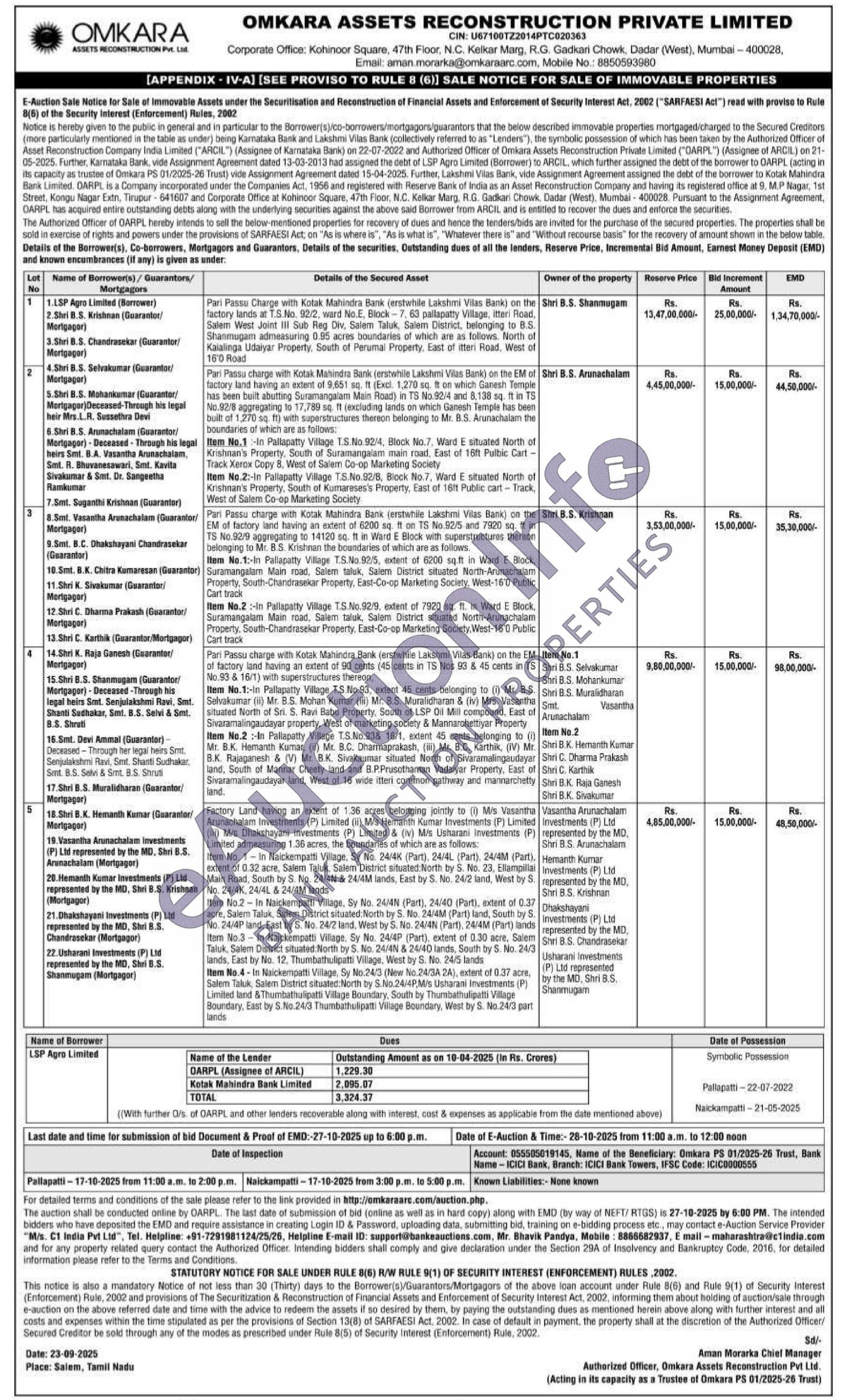 Pari Passu charge with Kotak Mahindra Bank (erstwhile Lakshmi Vilas Bank) on the EM of factory land having an extent of 90 cents (45 cents in TS Nos 93 & 45 cents in TS No.93 & 16/1) with superstructures thereon, Item No.1:-in Pallapatty Village T.S.No.93, extent 45 cents belonging to (1) Mr. B.S. Selvakumar (ii) Mr. B.S. Mohan Kumar (iii) Mr. B.S. Muralidharan & (iv) Mrs. Vasantha Smt. situated North of Sri. S. Ravi Babu Property, South of LSP Oil Mill compound, East of Sivaramalingaudayar property, West of marketing society & Mannarchettiyar Property Item No.2:-In Pallapatty Village T.S.No.938 16/1, extent 45 cents belonging to (1) Mr. B.K. Hemanth Kumar, (ii) Mr. B.C. Dharmaprakash, (iii) Mr. B.C. Karthik, (IV) Mr. B.K. Rajaganesh & (V) Mr. B.K. Sivakaumar situated North of Sivaramalingaudayar land, South of Mannar Cheety land and B.P.Prusothaman Vadaiyar Property, East of Sivaramalingaudayar land, West of 16 wide itteri common pathway and mannarchetty land.