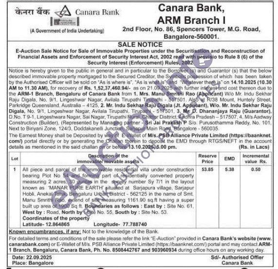 All piece and parcel of the immovable residential villa under construction bearing Plot No 54 and forming part of residentially converted property measuring 2 acres, 30 guntas in the survey number Sy 7/1 in the layout known as "MANAR PURE EARTH situated at Sarjapura village, Sarjapur Hobli, Anekal Taluk, Bengaluru Urban District-562125 in the name of Smt. Manu Smrithi Rao, extend of site measuring 1161.90 sq.ft having a super built up area of 1900 Sq ft. Boundaries as follows: East by: Site No. 61 West by: Road, North by: Site No. 55, South by: Site No. 53