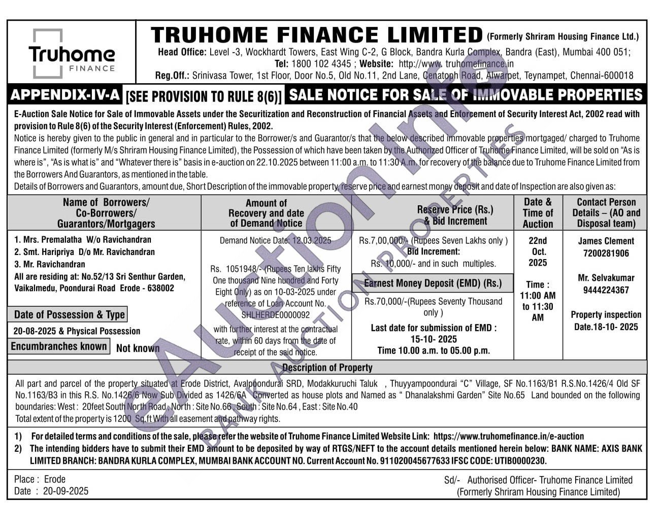 All part and parcel of the property situated at Erode District, Avalpoondurai SRD, Modakkuruchi Taluk, Thuyyampoondurai "C" Village, SF No.1163/B1 R.S.No.1426/4 Old SF No.1163/B3 in this R.S. No.1426/6 Now Sub Divided as 1426/6A Converted as house plots and Named as "Dhanalakshmi Garden" Site No.65 Land bounded on the following boundaries: West: 20feet South North Road, North: Site No.66, South: Site No.64, East: Site No.40
