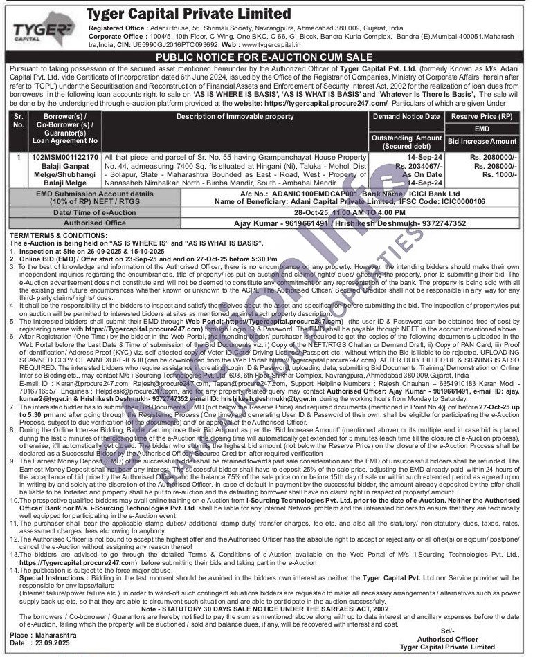 All that piece and parcel of Sr. No. 55 having Grampanchayat House Property No. 44, admeasuring 7400 Sq. fts situated at Hingani (Ni), Taluka - Mohol, Dist Solapur, State Maharashtra Bounded as East Road, West Property of Nanasaheb Nimbalkar, North-Biroba Mandir, South-Ambabai Mandir