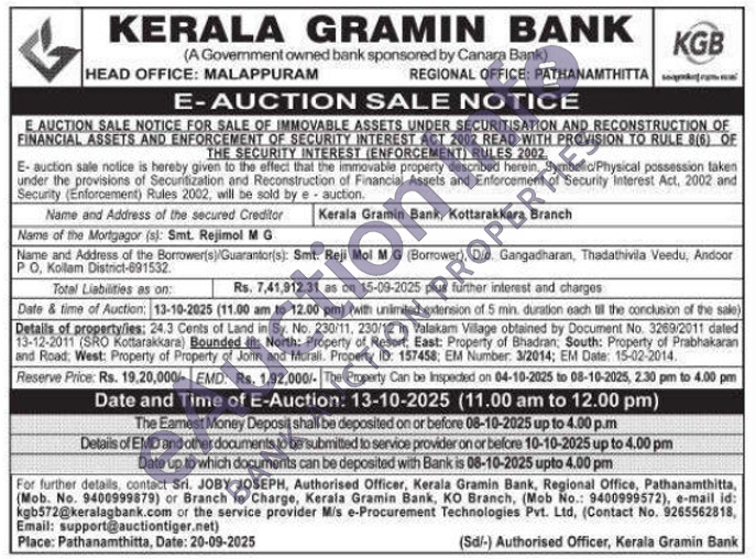 24.3 Cents of Land in Sy. No. 230/11, 230/12 in Valakam Village obtained by Document No. 3269/2011 dated 13-12-2011 (SRO Kottarakkara) Bounded in: North: Property of Resort; East: Property of Bhadran, South: Property of Prabhakaran and Road: West: Property of Property of John and Murali. Property ID: 157458; EM Number: 3/2014; EM Date: 15-02-2014.