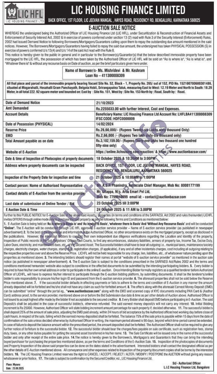 All that piece and parcel of the immovable property bearing Vacant Site No. 52, Black-1, Property No. 265/ out of 152, PID No. 152100700600301486, situated at Mogarahalli, Hosahalli Gram Panchayath, Belgola Hobli, Srirangapatna Taluk, measuring East to West: 12.19 Meler and North to South: 18.29 Meter, in all total 222. 92 square meter and bounded on: East by: Site No. 151, West by: Site No. 153 North by: Road, South by: Road.