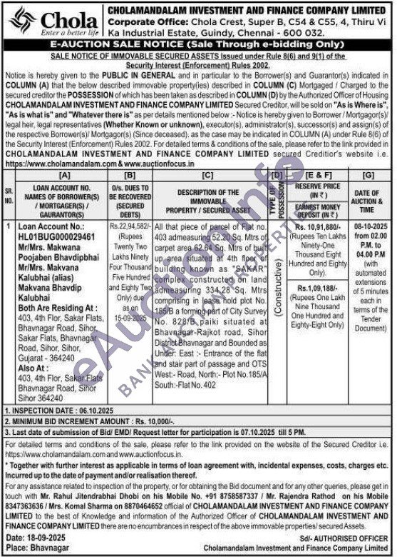 All that piece of parcel of Flat no. 403 admeasuring 52.20 Sq. Mtrs of carpet area 62.64 Sq. Mtrs of built up area situated at 4th floor of building known as "SAKAR complex constructed on land admeasuring 334.28 Sq. Mtrs comprising in lease hold plot No. 185/B a forming part of City Survey No. 828/B paiki situated at Bhavnagar-Rajkot road, Sihor District Bhavnagar and Bounded as Under East Entrance of the flat and stair part of passage and OTS West-Road, North:- Plot No. 185/A South: Flat No. 402