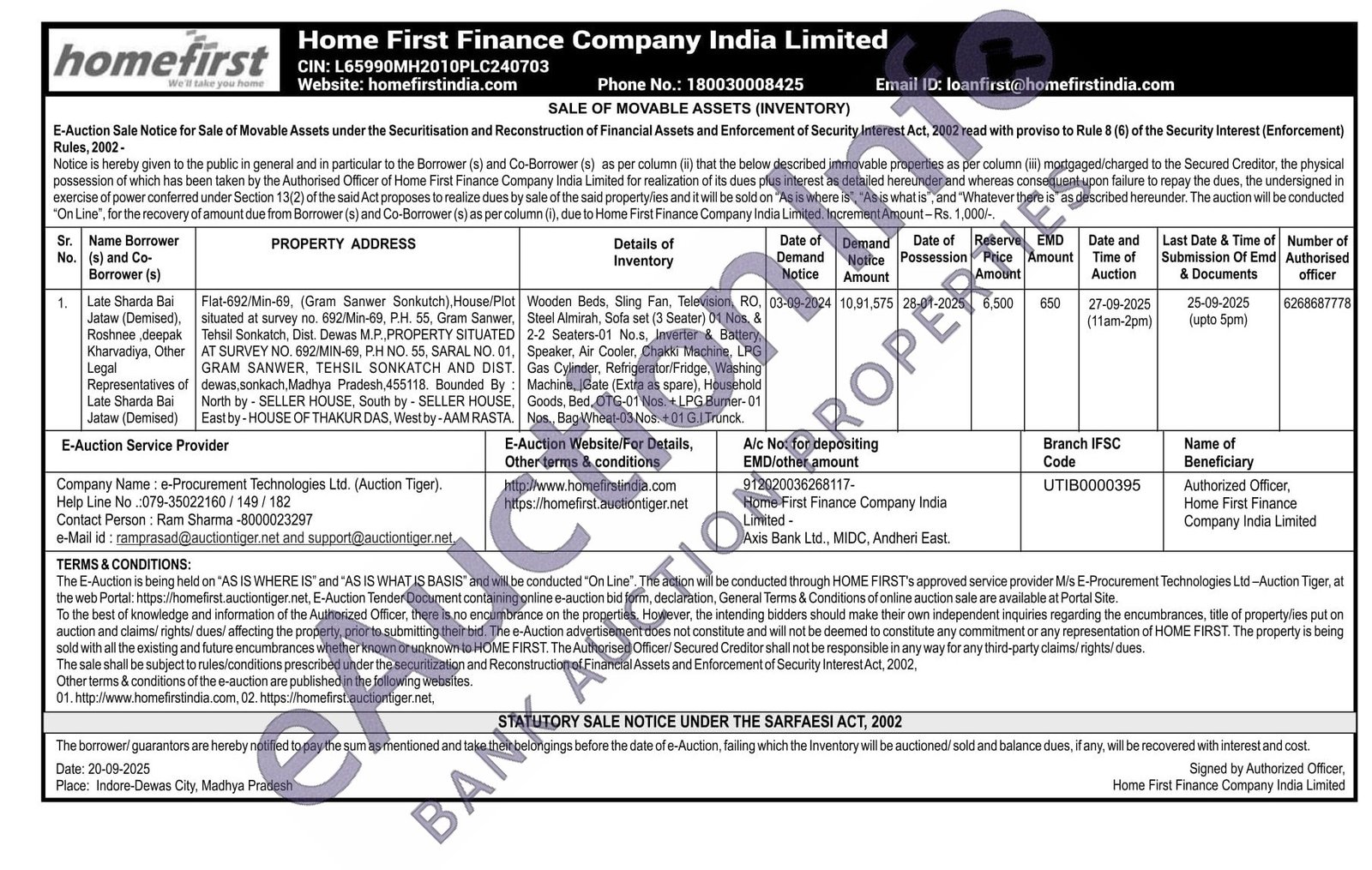 Wooden Beds, Sling Fan, Television, RO, Steel Almirah, Sofa set (3 Seater) 01 Nos. & 2-2 Seaters-01 No.s, Inverter & Battery, Speaker, Air Cooler, Chakki Machine, LPG Gas Cylinder, Refrigerator/Fridge, Washing Machine, Gate (Extra as spare), Household Goods, Bed, OTG-01 Nos. + LPG Bumer-01 Nos., Bag Wheat-03 Nos. +01 G. Trunck.