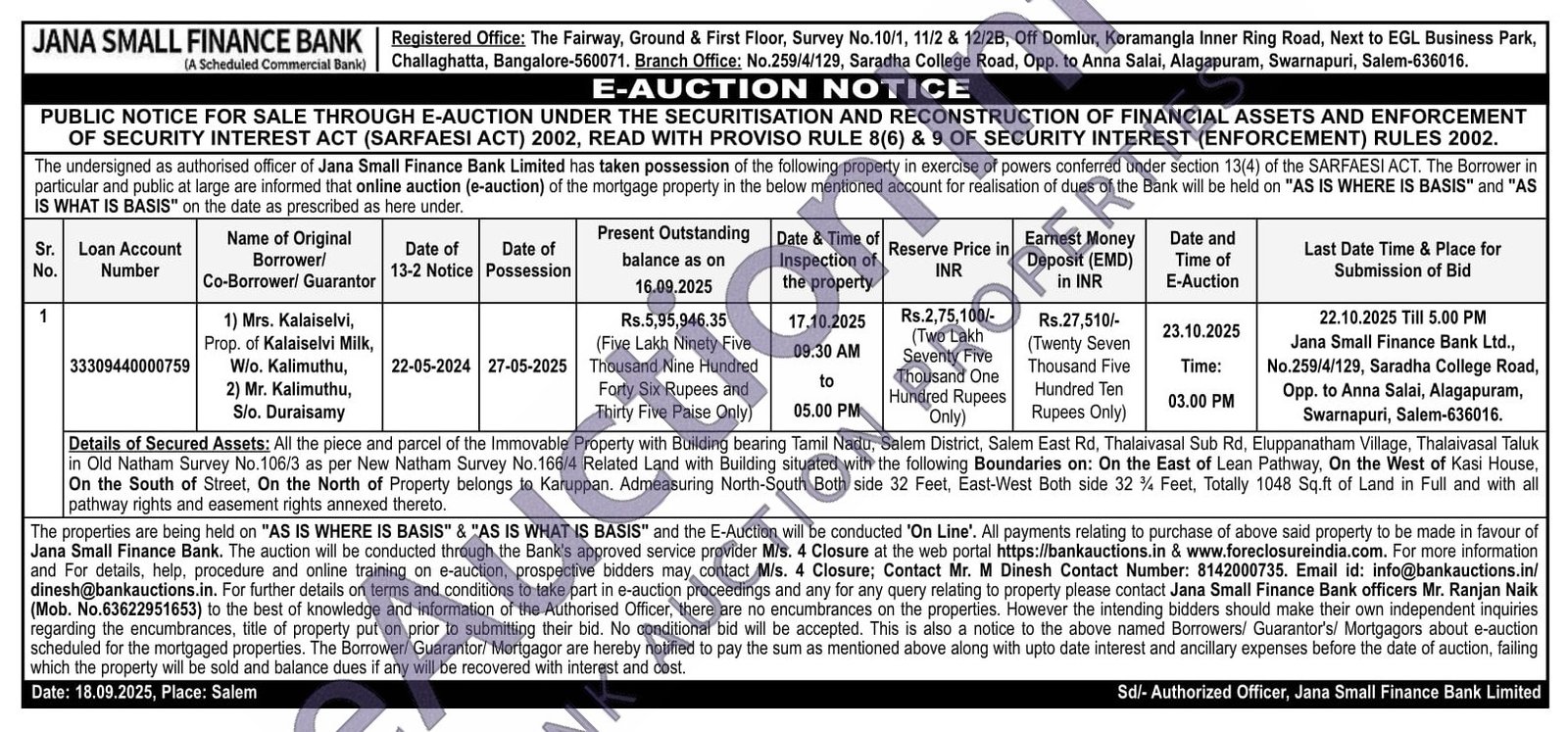 Details of Secured Assets: All the piece and parcel of the Immovable Property with Building bearing Tamil Nadu, Salem District, Salem East Rd, Thalaivasal Sub Rd, Eluppanatham Village, Thalaivasal Taluk in Old Natham Survey No. 106/3 as per New Natham Survey No. 166/4 Related Land with Building situated with the following Boundaries on: On the East of Lean Pathway, On the West of Kasi House, On the South of Street, On the North of Property belongs to Karuppan. Admeasuring North-South Both side 32 Feet, East-West Both side 32% Feet, Totally 1048 Sq.ft of Land in Full and with all pathway rights and easement rights annexed thereto.