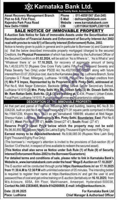 All that part and parcel of Freehold Industrial land and building, bearing MC No.8 30-3342/26, built on plot No.6-min, land measuring 271.91 square yards comprised in Khata No. 1184/1239, Khasra No.s 18/23 as per Jamabandi 1998/99, situated at Moti Nagar. Sherpur Kalan, Ludhiana, Belonging to Mrs. Pinky Sethi. Boundaries: East: Plot No.6 (89-0), West: Plot No.5 (89-07), North: Street (27-6"), South: Road (27-6)