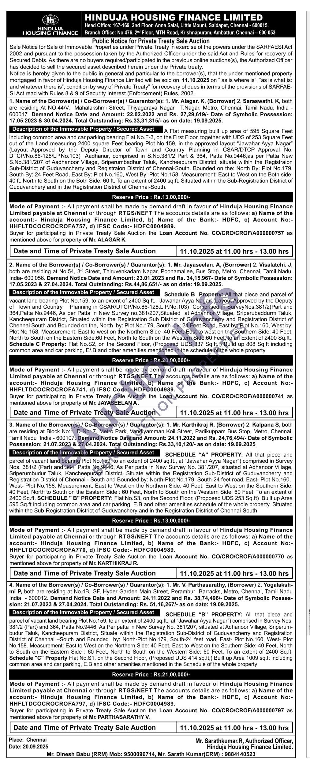All that piece and parcel of vacant land bearing Plot No. 159, to an extent of 2400 sq.ft., at "Jawahar Ayya Nagar") comprised in Survey Nos. 381/2 (Part) and 364, Patta No.9446, As Per patta in New Survey No. 381/207, situated at Adhanoor Village, Sriperum-budur Taluk, Kancheepuram District, Situate within the Registration Sub-District of Guduvancherry and Registration District of Chennai -South and Bounded by: North-Plot No.179, South-24 feet road, East- Plot No.160, West- Plot No.158. Measurement: East to West on the Northern Side: 40 Feet, East to West on the Southern Side: 40 Feet, North to South on the Eastern Side 60 Feet, North to South on the Western Side: 60 Feet, To an extent of 2400 Sq.ft. Schedule "C" Property Flat No.S1, on the Second Floor, (Proposed UDS 414 sq.ft.) Built up Area 1009 sq.ft including common area and car parking, E.B and other amenities mentioned in the Schedule of the whole property