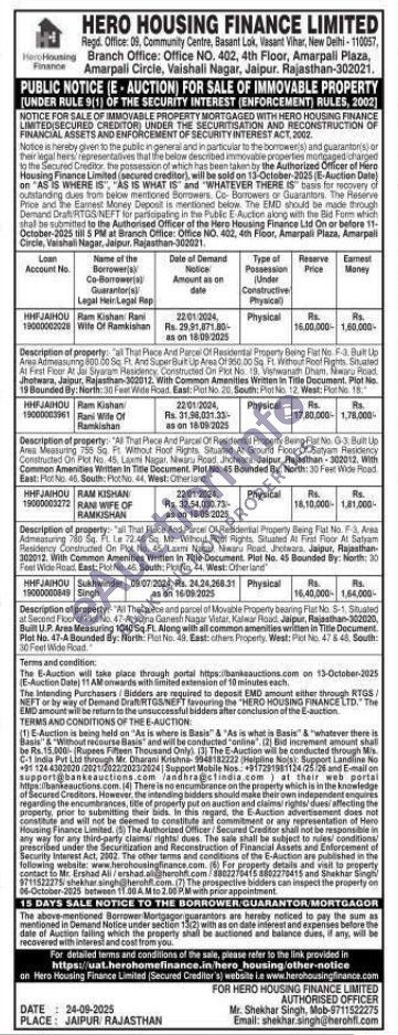 Description of property:"all That Piece And Parcel Of Residential Property Being Flat No. F-3, Area Admeaturing 780 Sq. FLL 7246 S M So Mr. Without Rool Rights Situated At First Floor At Satyam Residency Constructed On Plot No. 45. Laxmi Nagar Niwaru Road Jhotawara, Jaipur, Rajasthan 302012. With Common Amenities Written In Title Document. Plat No. 45 Bounded By: North: 30 Feet Wide Road East: Plot No. 45 South: Plot No. 44, West: Other land"