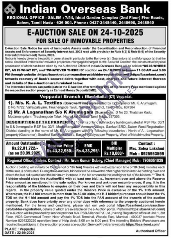 10 cents of land with factory building situated at RSF No: 33/1 to 5 & 9 merged in RSF No: 33/1, Modamangalam Ammani Village, Sankari SRD, Salem West Registration District standing in the name of Mr. K. Arumugam with the following boundaries: North of A. Loganathan property (Guarantor), South of East West Road, East of Palaiyappan Property, West of Natchimuthu Property
