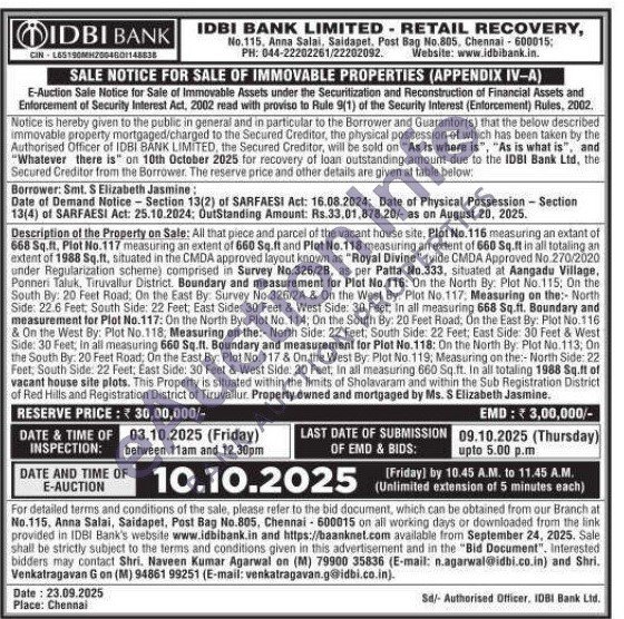 All that piece and parcel of the vacant house site, Plot No.116 measuring an extant of 668 Sq.ft. Plot No.117 measuring an extent of 660 Sq.ft and Plot No.118 measuring an extent of 660 Sq.ft in all totaling an extent of 1988 Sq.ft, situated in the CMDA approved layout known as "Royal Divine" (vide CMDA Approved No.270/2020 under Regularization scheme) comprised in Survey No.326/28, as per Palta No.333, situated at Aangadu Village, Ponneri Taluk, Tiruvallur District. Boundary and measurement for Plat No.116: On the North By: Plot No.115, On the South By: 20 Feet Road, On the East By: Survey No.326/2A & On the West By. Plot No.117; Measuring on the:- North Side: 22.6 Feet, South Side: 22 Feet, East Side: 30 Feet & West Side: 30 Feet, In all measuring 668 Sq.ft. Boundary and measurement for Plot No.117: On the North By: Plot No. 114; On the South By: 20 Feet Road, On the East By: Plot No.116 & On the West By: Plot No.118, Measuring on the:- North Side: 22 Feet, South Side: 22 Feet; East Side: 30 Feet & West Side: 30 Feet, in all measuring 660 Sq.ft. Boundary and measurement for Plot No.118: On the North By: Plot No. 113, On the South By: 20 Feet Road, On the East By: Plot No. 117 & On the West By: Plot No. 119; Measuring on the:- North Side: 22 Feet, South Side: 22 Feet; East Side: 30 Feet & West Side: 30 Feet, in all measuring 660 Sq.ft. In all totaling 1988 Sq.ft of vacant house site plots. This Property is situated within the limits of Sholavaram and within the Sub Registration District of Red Hills and Registration District of Tiruvallur. Property owned and mortgaged by Ms. S Elizabeth Jasmine