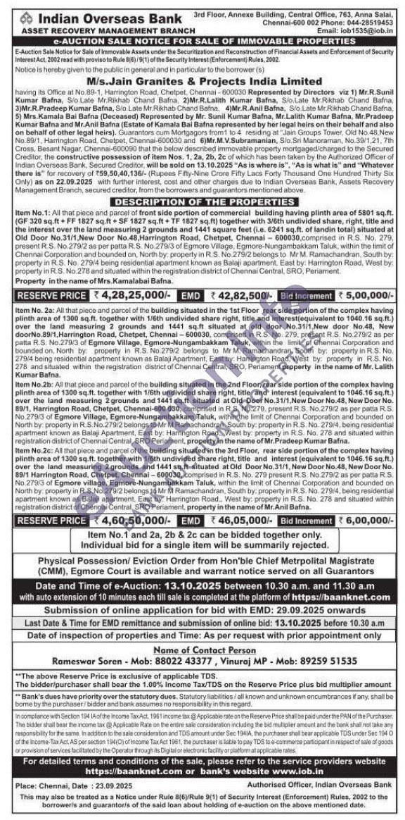 Item No.1: All that piece and parcel of front side portion of commercial building having plinth area of 5801 sq.ft. (GF 320 sq.ft FF 1827 sq.ft SF 1827 sq.ft TF 1827 sq.ft) together with 3/6th undivided share, right, title and the interest over the land measuring 2 grounds and 1441 square feet (ie. 6241 sq.ft. of landin total situated at Old Door No.31/1, New Door Door No.48, Harrington Road, Chetpet, Chennai-600030,comprised in RS. No. 279. present R. 8. No. 279/2 as per patta R. S. No.279/3 of Egmore Village, Egmore-Nungambakkam Taluk, within the limit of Chennai Corporation and bounded on, North by: property in R. S. No.279/2 belongs to Mr M. Ramachandran, South by property in R.5. No. 279/4 No. 279/4 being residential apartment known as Balaji apartment. East by East by: Hamngton Road, West by property in R.S. No 278 and situated within the registration district of Chennai Central, SRO, Periament. Property in the name of Mrs. Kamalabai Bafna
