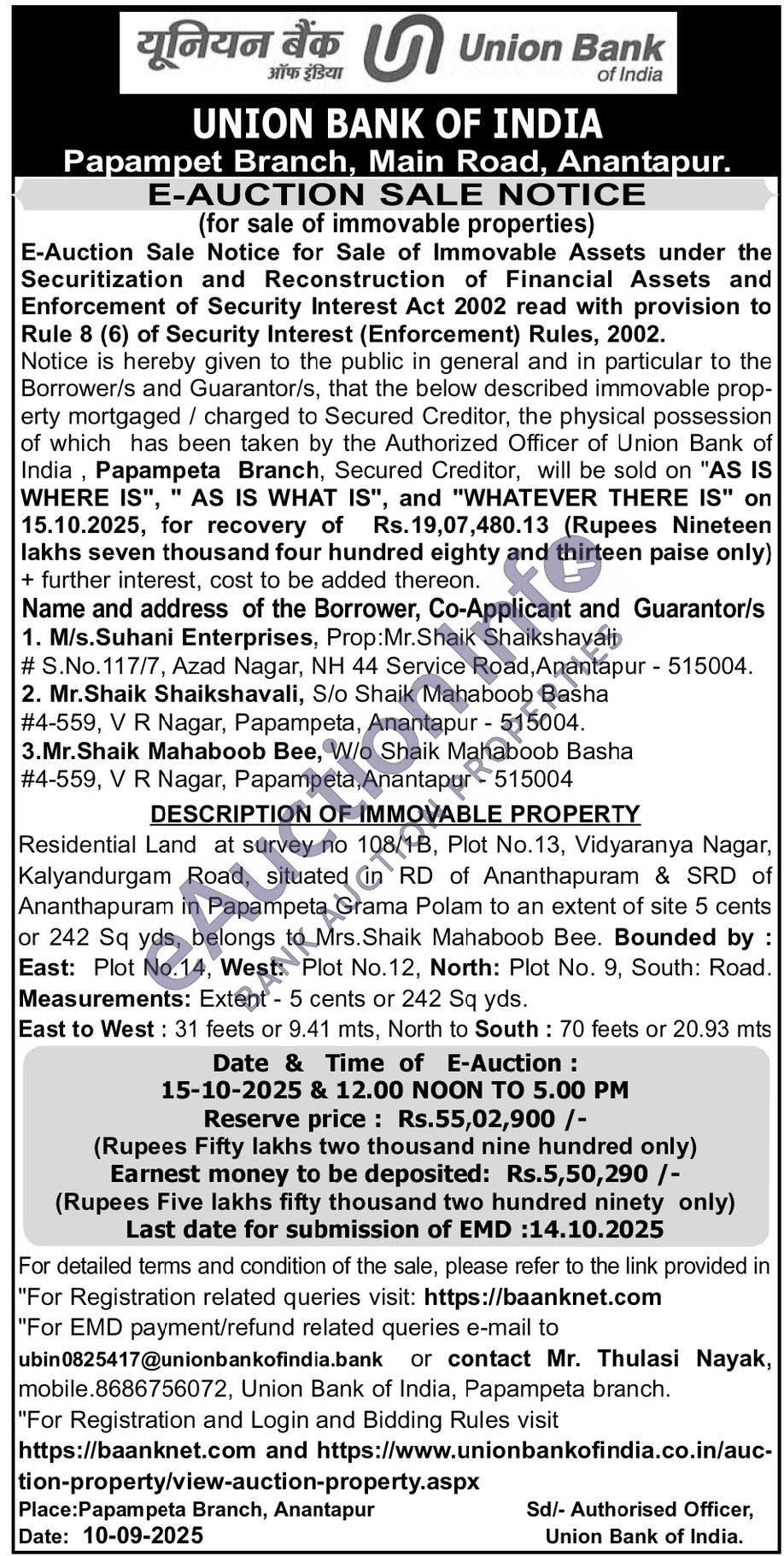 Residential Land at survey no 108/1B, Plot No.13, Vidyaranya Nagar, Kalyandurgam Road, situated in RD of Ananthapuram & SRD of Ananthapuram in Papampeta Grama Polam to an extent of site 5 cents or 242 Sq yds, belongs to Mrs. Shaik Mahaboob Bee. Bounded by: East: Plot No.14, West: Plot No.12, North: Plot No. 9, South: Road. Measurements: Extent - 5 cents or 242 Sq yds. East to West: 31 feets or 9.41 mts, North to South: 70 feets or 20.93 mts