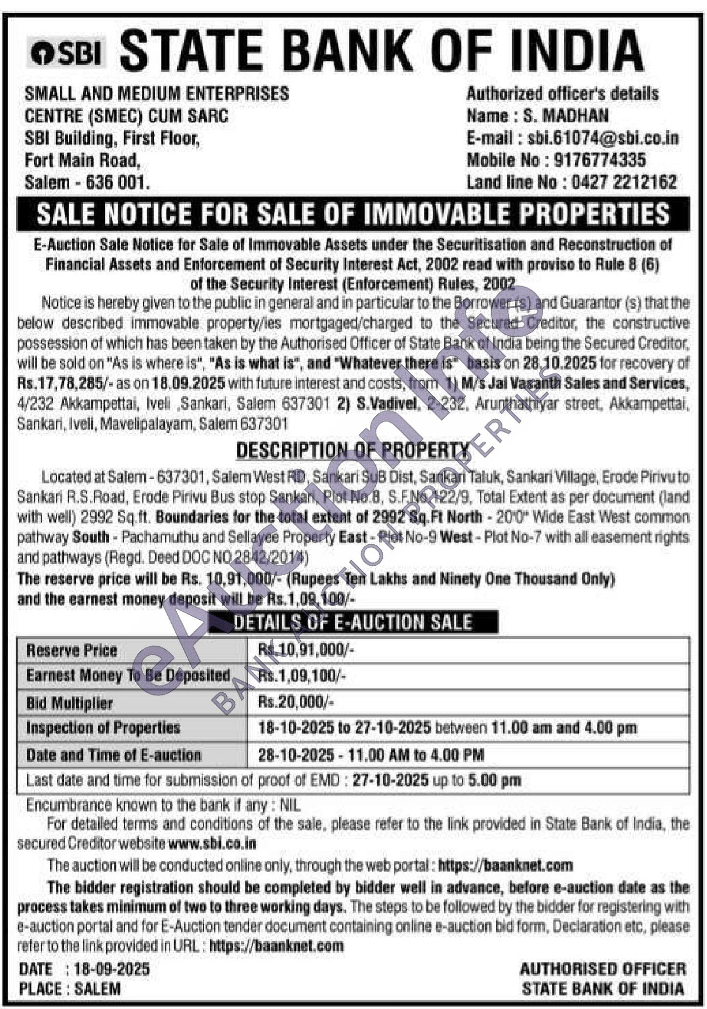 DESCRIPTION OF PROPERTY : Located at Salem-637301, Salem West RD, Sankari SuB Dist, Sankari Taluk, Sankari Village, Erode Pirivu to Sankari R.S.Road, Erode Pirivu Bus stop Sankari, Plot No.8, S.F.No. 122/9, Total Extent as per document (land with well) 2992 Sq.ft. Boundaries for the total extent of 2992 Sq.Ft North-20'0" Wide East West common pathway South-Pachamuthu and Sellayee Property East-Plot No-9 West-Plot No-7 with all easement rights and pathways (Regd. Deed DOC NO 2842/2014)
