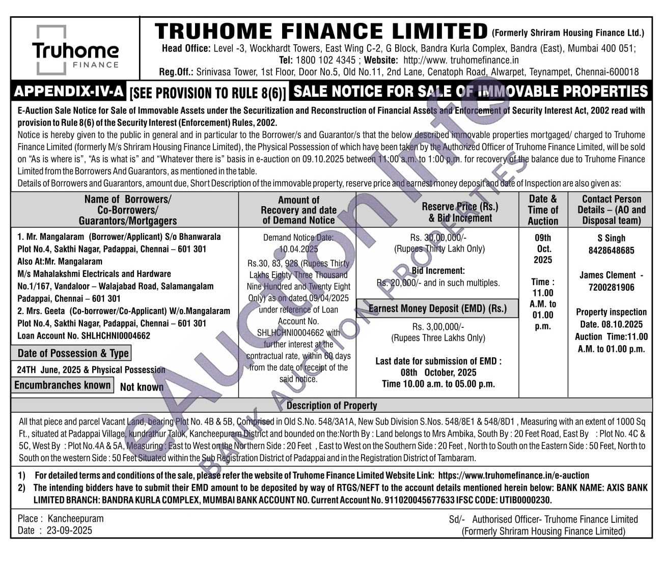 All that piece and parcel Vacant Land, bearing Plot No. 4B & 5B, Comprised in Old S.No. 548/3A1A, New Sub Division S.Nos. 548/8E1 & 548/8D1, Measuring with an extent of 1000 Sq Ft., situated at Padappai Village, kundrathur Taluk, Kancheepuram District and bounded on the: North By: Land belongs to Mrs Ambika, South By: 20 Feet Road, East By: Plot No. 4C & 5C, West By: Plot No.4A & 5A, Measuring: East to West on the Northern Side: 20 Feet, East to West on the Southern Side: 20 Feet, North to South on the Eastern Side: 50 Feet, North to South on the western Side: 50 Feet Situated within the Sub Registration District of Padappai and in the Registration District of Tambaram.