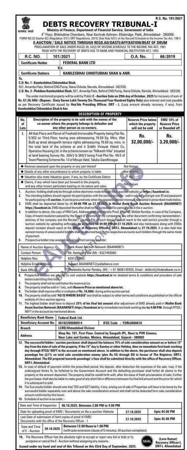 All that Piece and Percal of Freshold id in Immovable Property being Flat No. E/302 on Thint Floor, having area admeasuring 78.69 Sq. Mtrs. (Net Built op area) along with terrace rights admeasuring 78.69 sq mtrs. in the total land of the scheme at and it Siddhi Vinayak (Val Co Operative Housing Ltd. in the schisme known as "Nilkanth Villa situated at land bearing Survey No. 388/2 & 389/3 being Final Plot No. 492 of Town Planning Scheme No. 13 of Mouje-Valol, Teluke-Gandhinagar