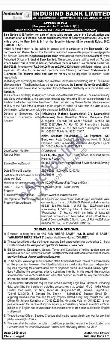 All the piece and parcel of land and building in dental House constructed on the land of Plot No 66. Pakee Land admeasuring 56-525 (Sub Plot No.60/1) of R.S No. 122/2/Pakee Lind admeasuring Ac3-08 Sq Mtrs of Khandhal Known as Preranadham 2 bcaled within the limits of Junagadh Municipal Corporation and bounded as: -East-Road West-Land of Common Plot No.2 North -Land of Plot No 96 Pakee Sub Pict No. 06/2) South-Land of RotNo.65