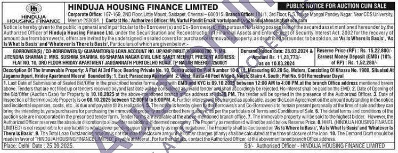 A Flat At 3rd Floor, Bearing Private No. 10, Constructed On Plot Number 10 & 11, Measuring 60.20 Sq. Meters, Consisting Of Khasra No. 1908, Situated At Jagannathpuri, Hridey Apartment Meerut Bounded By: 1. East: Parasdeep Apartment 2. West; Rasta 40 Feet Wide 3. North; Stairs 4. South; Plot No. 9 Of Rameshwar Dayal