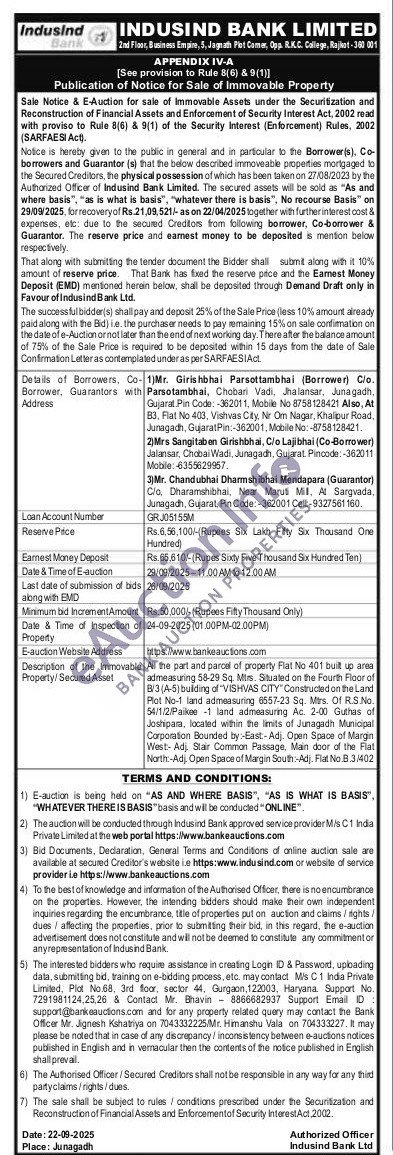All the part and parcel of property Flat No 401 built up anes admeasuring 58-29 Sq. Mts. Situated on the Fourth Floor of B3A-5) bulding of "VISHVAS CITY" Constructed on the Land Plot No-1 land admeasuring 6557-23 Sq. Mrs. Of R.S.No. 54/1/2/Paikee -1 land admeasuring Ac. 2-00 Guthas of Joshipara, located within the Imits of Junagadh Municipal Corporation Bounded by East Adj. Open Space of Margin West-Ad, Star Common Passage, Main door of the Flat North-Adi. Open Space of Margin South-Adj Pat No. 8.3/402