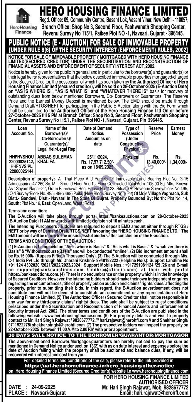 Description of property: All That Piece And Parcels Of Immovable Land Bearing Plot No. G-15 Admeasuring 47.260 Sq. Mtr. Ground Floor And 1st Floor Contracted Total Adm. 105.00 Sq. Mtrs, Known As Shyam Nagar-2,", Gram Panchayat Reg. House No 1123, Situate At Revenue Survey/block No.495, (Old Survey/Block No. 495+496+498) Paiki, (New Block/Survey No 1022) Of Moje Village Vagreach, Sub Distt.- Gandevi, Distt.- Navsari In The State Of Gujrat. Property Bounded By: North: Plot No. 14, South: Plot No. 16. East: Open Land, West: Road