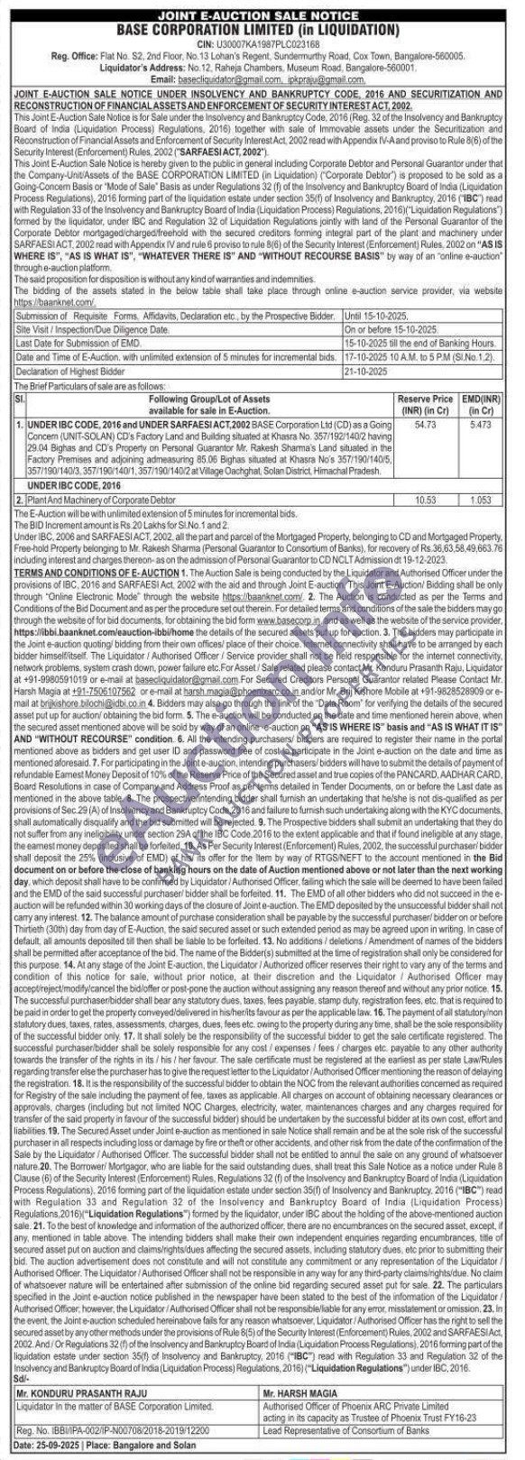 1. UNDER IBC CODE, 2016 and UNDER SARFAESI ACT,2002 BASE Corporation Ltd (CD) as a Going Concem (UNIT-SOLAN) CD's Factory Land and Building situated at Khasra No. 357/192/140/2 having 29.04 Bighas and CD's Property on Personal Guarantor Mr. Rakesh Sharma's Land situated in the Factory Premises and adjoining admeasuring 85.06 Bighas situated at Khasra No's 357/190/140/5, 357/190/140/3,357/190/140/1,357/190/140/2 at Village Dachghat, Solan District, Himachal Pradesh.