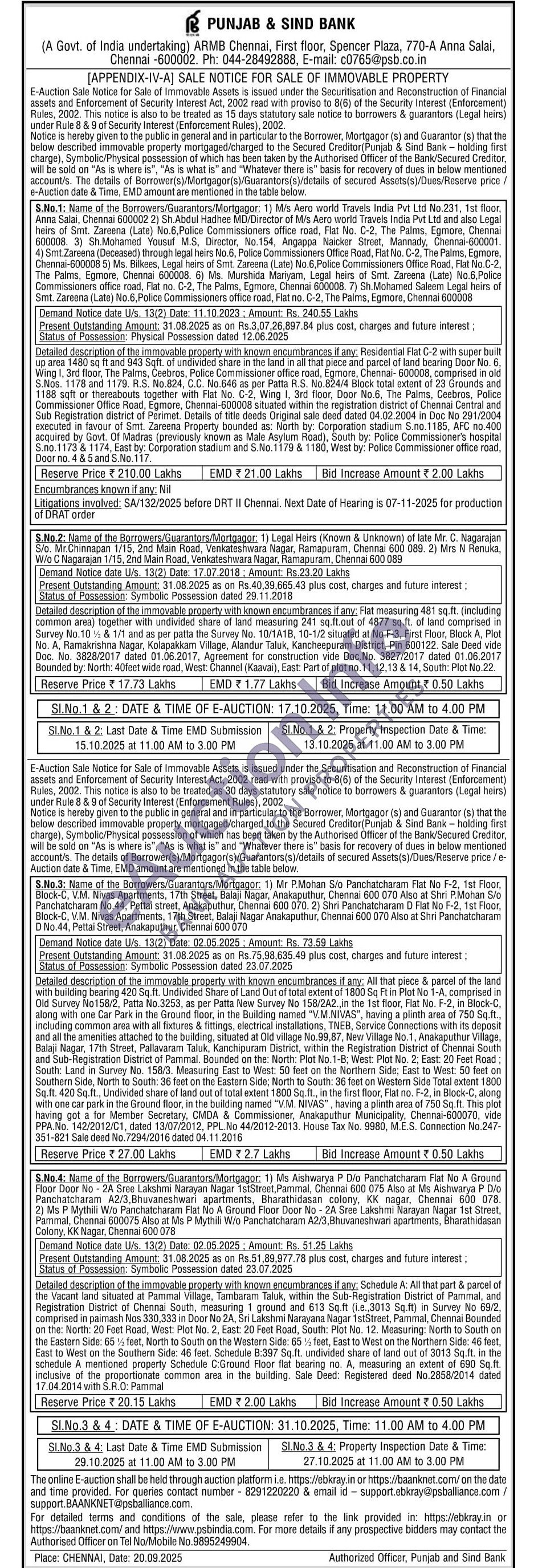 Detailed description of the immovable property with known encumbrances if any: Schedule A: All that part & parcel of the Vacant land situated at Pammal Village, Tambaram Taluk, within the Sub-Registration District of Pammal, and Registration District of Chennai South, measuring 1 ground and 613 Sq.ft (i.e.,3013 Sq.ft) in Survey No 69/2, comprised in paimash Nos 330,333 in Door No 2A, Sri Lakshmi Narayana Nagar 1stStreet, Pammal, Chennai Bounded on the: North: 20 Feet Road, West: Plot No. 2, East: 20 Feet Road, South: Plot No. 12. Measuring: North to South on the Eastern Side: 65% feet, North to South on the Western Side: 65% feet, East to West on the Northern Side: 46 feet, East to West on the Southern Side: 46 feet. Schedule B:397 Sq.ft. undivided share of land out of 3013 Sq.ft. in the schedule A mentioned property Schedule C:Ground Floor flat bearing no. A, measuring an extent of 690 Sq.ft. inclusive of the proportionate common area in the building. Sale Deed: Registered deed No.2858/2014 dated 17.04.2014 with S.R.O: Pammal