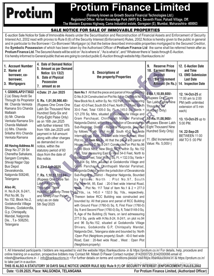 Item No.1 All that the piece and parcel of House bearing D.No.8-24 Constructed on Plot No.94, in Old Block No.2. New Block No.8, within Sy. No. 152 Part, Total measuring East 42-0 Feet, South 55-0 Feet, North 27-0 Feet, South 30-0 Feet, Total 1305-0 Sq. Ft. 145.0 Sq. Yards 121.278 Sq. Mirs, situated at Godakondla Village and Gram Panchayat, Chinthapalli Mandal Parishad, Nalgonda District, within the jurisdiction of Devarakonda Sub-Registrar, District - Registrar Nalgonda, Bounded by follows: North Plot no.96, South 40-0 feet wide Internal Road, East 20-0 feet wide Internal Road, West Plot no. 95 Item No.2- All that the piece and parcel of House bearing D.No.8-24/1 Constructed on Plot No.96 in Old Block No.2, New Block No.8, within Sy. No.152 Part, Total measuring East to West 54-0 Feet, North to South 22-0 Feet, Total 1188-0 Sq. Ft. 132.0 Sq. Yards = 110.404 Sq. Mtrs, situated at Godakondla Village and Gram Panchayat, Chinthapalli Mandal Parishad, Nalgonda District, within the jurisdiction of Devarakonda Sub-Registrar, District Registrar Nalgonda, Bounded by follows: North Plot No.97, South Plot Nos. 94, 95, East 20-0 feet wide Internal Road, West Plot No. 117 Total of Item No.1 & 2 277.0 Sq. Yds., ie, 145.0 132.0 Sq. Yds., respectively, Thereon below RCC Building was constructed and bounded by: All that piece and parcel of RCC Building with Ground Floor (1760-0) Sq. ft, First Floor (1760-0) Sq. ft and Second Floor (1760-0) Sq. ft. Total 5148-0 Sq. ft, Age of the Building (5) Years, on land admeasuring 277.0 Sq. yards with H.No.8-24, 8-24/1, on plot no.94 and 96 Sy.No. 152, situated at Godakondla Village Shivaru, Godakondla G.P. Chintapally Mandal, Nalgonda Dist., Telangana state and bounded by: North Open Plot (Neighbors property) South: 40-0 feet wide Road, East: 20-feet wide Road, West Open Plot (Neighbors property)