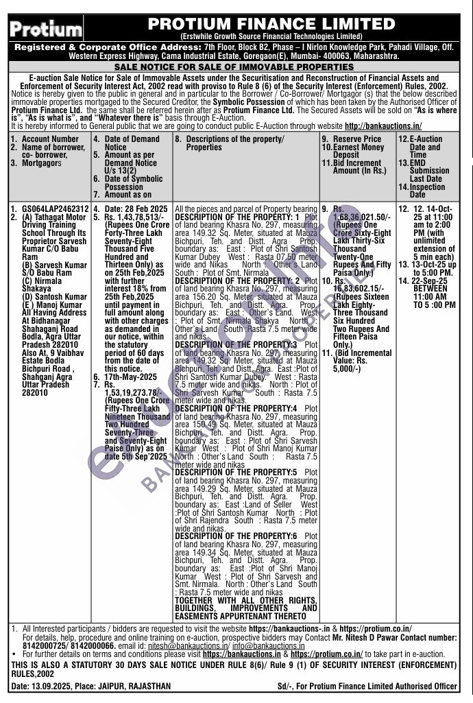 All the pieces and parcel of Property bearing 9. Rs. DESCRIPTION OF THE PROPERTY: 1 Plot of land bearing Khasra No. 297, measuring area 149.32 Sq. Meter, situated at Mauza Bichpuri, Teh and Distt. Agra boundary as: East: Plot of Shri Santosh Kumar Dubey West: Rasta 07.50 meter wide and Nikas North: Other's Land South Plot of Smt. Nirmala DESCRIPTION OF THE PROPERTY: 2 Plot of land bearing Khasra No. 297, measuring area 156.20 Sq. Meter, situated at Mauza Bichpuri, Teh and Distt. Agra. Prop. boundary as: East: Other's Land. West Plot of Smt. Nirmala Shakya North: Other's Land South Rasta 7.5 meter wide and nikas DESCRIPTION OF THE PROPERTY:3 Plot of land bearing Khasra No. 297, measuring area 149.32 Sq. Meter, situated at Mauza Bichpuri, Teh, and Distt. Agra. East : Plot of Shri Santosh Kumar Dubey. West: Rasta 7.5 meter wide and nikas. North Plot of Shri Sarvesh Kumar South: Rasta 7.5 meter wide and nikas. DESCRIPTION OF THE PROPERTY:4 Plot of land bearing Khasra No. 297, measuring area 150.49 Sq. Meter, situated at Mauză Bichpuri, Teh, and Distt. Agra. Prop. boundary as: East Plot of Shri Sarvesh Kumar West Plot of Shri Manoj Kumar North: Other's Land South Rasta 7.5 meter wide and nikas DESCRIPTION OF THE PROPERTY:5 Plot of land bearing Khasra No. 297, measuring area 149.29 Sq. Meter, situated at Mauza Bichpuri, Teh, and Distt. Agra. Prop. boundary as: East Land of Seller West Plot of Shri Santosh Kumar North Plot of Shri Rajendra South Rasta 7.5 meter wide and nikas. DESCRIPTION OF THE PROPERTY:6 Plot of land bearing Khasra No. 297, measuring area 149.34 Sq. Meter, situated at Mauza Bichpuri, Teh, and Distt. Agra. Prop. boundary as: East Plot of Shri Manoj Kumar West Plot of Shri Sarvesh and Smt. Nirmala. North: Other's Land South : Rasta 7.5 meter wide and nikas TOGETHER WITH ALL OTHER RIGHTS, BUILDINGS IMPROVEMENTS AND EASEMENTS APPURTENANT THERETO