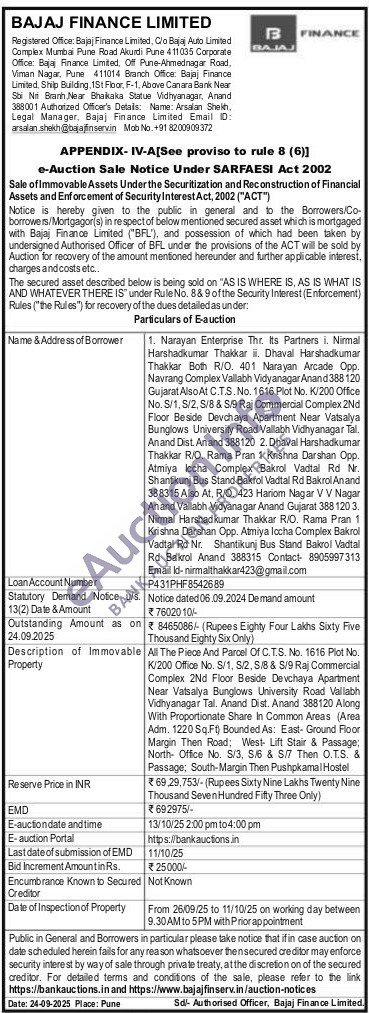 All The Piece And Parcel Of C.T.S. No. 1616 Plot No. K/200 Office No. S/1, S/2, S/8 & S/9 Raj Commercial Complex 2Nd Floor Beside Devchaya Apartment Near Vatsalya Bunglows University Road Vallabh Vidhyanagar Tal. Anand Dist. Anand 388120 Along With Proportionate Share In Common Areas (Area Adm. 1220 Sq.Ft) Bounded As: East- Ground Floor Margin Then Road: West Lift Stair & Passage; North- Office No. S/3, S/6 & S/7 Then O.T.S. & Passage; South-Margin Then Pushpkamal Hostel