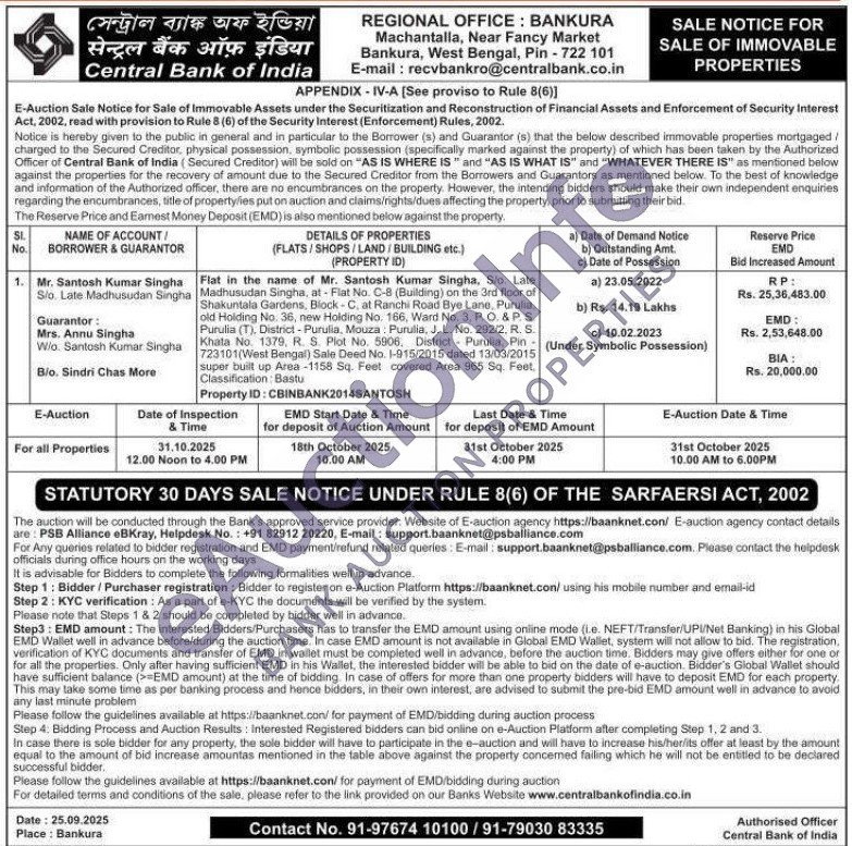 Flat in the name of Mr. Santosh Kumar Singha, Sio. Late Madhusudan Singha, at-Flat No. C-8 (Building) on the 3rd floor of Shakuntala Gardens, Block-C. at Ranchi Road Bye Lane, Purulia, old Holding No. 36, new Holding No. 166, Ward No. 3, P. O. & PS Purulia (T), District-Purulia, Mouza Purulia, J. L. No. 292/2, R. S. Khata No. 1379. R. S. Plot No. 5906. District Purulla, Pin 723101(West Bengal) Sale Deed No. 1-915/2015 dated 13/03/2015 super built up Area-1158 Sq. Feet covered Area 965 Sq. Fest Classification: Bastu