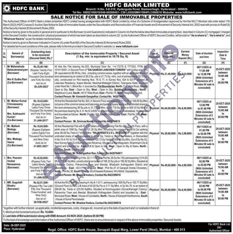 All that Residential Flat with R.C.C. pillars and roof bearing Flat No.502, Fourth Floor, with a plinth area of 1090 Sq. Feet or 101.26 Sq Mtrs, including the common areas & Car parking area :80-00 Sq. Feet or 7.43 Sq Mtrs, "RAJSHREE'S U.V.L. RESIDENCY" together with the undivided share of land equivalent to 47.41 Sq. Yards or 39.64 Sq. Meters, in Dismantled H.No:10-4-161 810-4-162, an extent of 725.73 Sq Yards or 606.80 Sq. Mtrs, Out of Sy No.52, New Survey No. 122 of Burhanpuram Revenue, Situated at Mamillagudem, Khamman City & District and bounded by: East: Lift & Open to Sky, West: Open to Sky & Stairs, North: Corridor, South: Open to Sky.