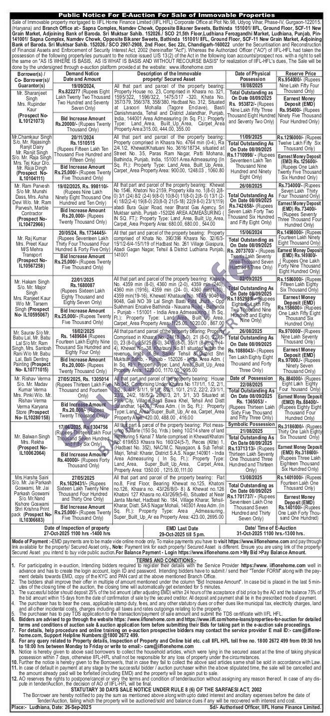 7) All that part and parcel of the property bearing: House No 345, Comprising Under Khasra No 17/1/1, 1/2, 2/1, 2/2, 3, 4/1, 8/1/1, 9/1/1, 8/2/1, 10/1, 21/2, 22/2, 23/1/1, 23/2, 24/2, 18/5/2, 26//1/3, 2/1, 3/1, 3/3 Situated at Pink City, Village Basti Bawa Khel, Tehsil And Distt Jalandhar, 144001. Area Adm. (In Sq. Ft.): Property Type: Land Area, Super Built Up Area, Carpet Area Property Area: 420.00, 488.00, 416.00