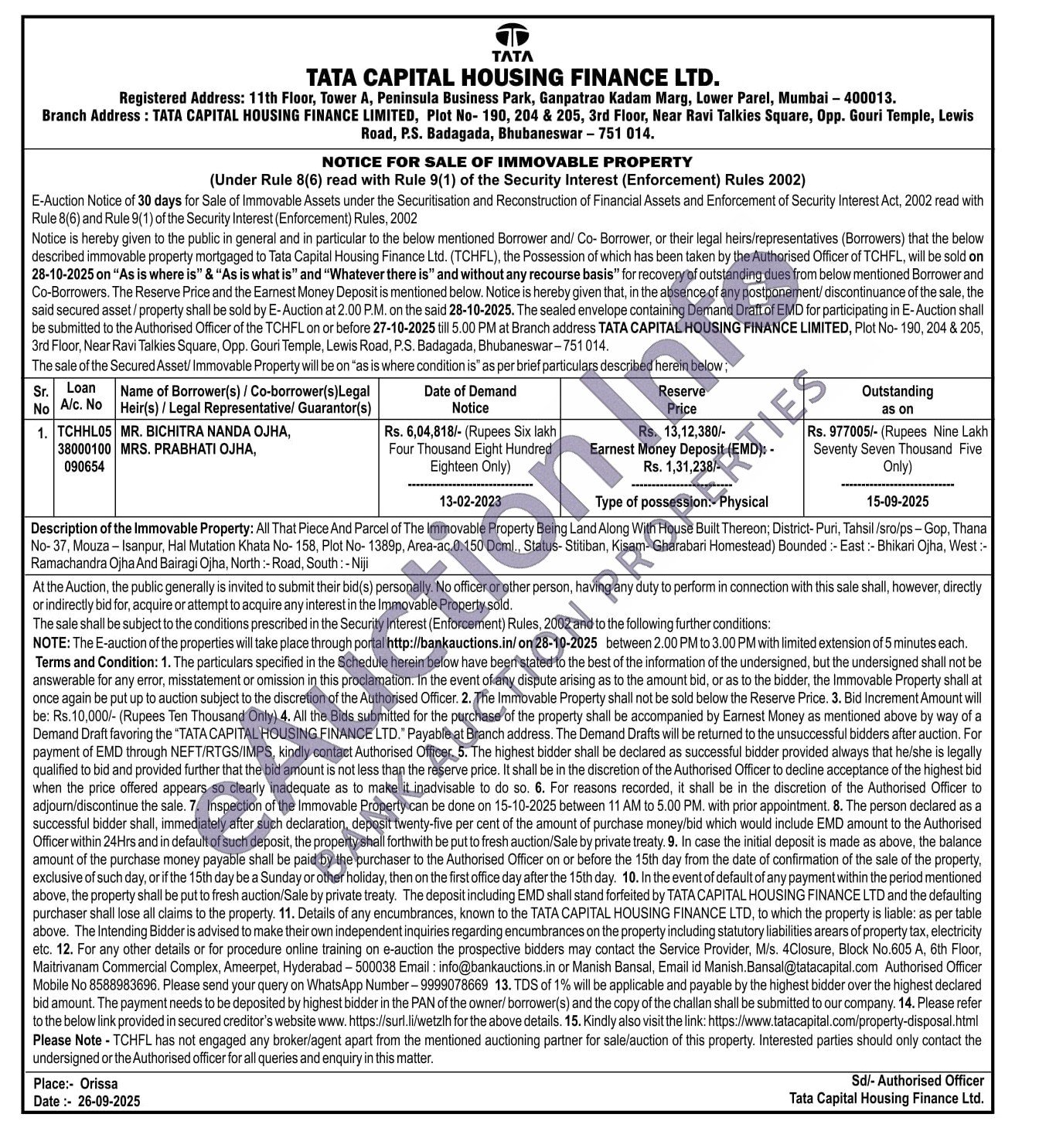 All That Piece And Parcel of The Immovable Property Being Land Along With House Built Thereon; District-Puri, Tahsil/sro/ps-Gop, Thana No-37, Mouza-Isanpur, Hal Mutation Khata No-158, Plot No- 1389p, Area-ac.0.150 Dcml., Status- Stitiban, Kisam- Gharabari Homestead) Bounded:- East:- Bhikari Ojha, West :-Ramachandra Ojha And Bairagi Ojha, North:-Road, South: - Niji