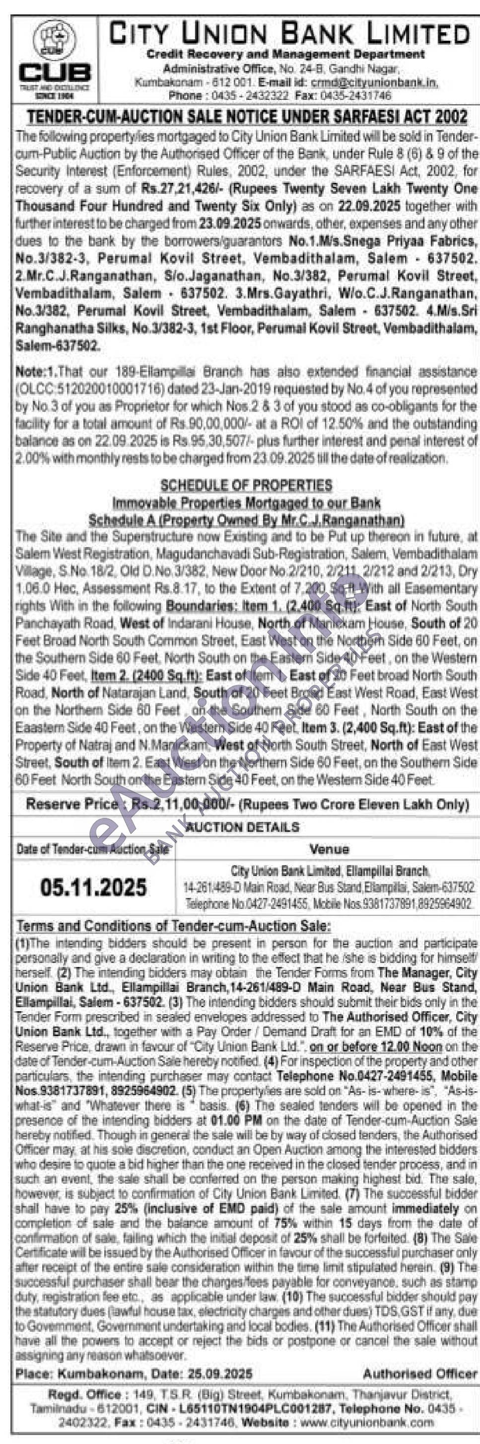 The Site and the Superstructure now Existing and to be Put up thereon in future, at Salem West Registration, Magudanchavadi Sub-Registration, Salem, Vembadithalam Village, S. No. 18/2, Old D.No. 3/382, New Door No 2/210, 2/211, 2/212 and 2/213, Dry 1.06.0 Hec, Assessment Rs.8.17, to the Extent of 7,200 Sq.ft With all Easementary ights With in the following Boundaries: item 1. (2.400 Sq.ft): East of North South Panchayath Road, West of Indarani House, North of Manickam House, South of 20 Feet Broad North South Common Street, East West on the Northem Side 60 Feet, on the Southern Side 60 Feet, North South on the Eastern Side 40 Feet, on the Western Side 40 Feet, Item 2. (2400 Sq ft): East of itom 1, East of 20 Feet broad North South Road, North of Nalarajan Land, South of 20 Feet Broad East West Road, East West on the Northem Side 60 Feet on the Southern Side 60 Feet, North South on the Eaastem Side 40 Feet, on the Western Side 40 Feet, Item 3. (2,400 Sq.ft): East of the Property of Natraj and N. Manickam, West of North South Street, North of East West Street, South of Ilem 2. East West on the Northem Side 60 Feet, on the Southern Side 60 Feet North South on the Eastern Side 40 Feet, on the Western Side 40 Feet.