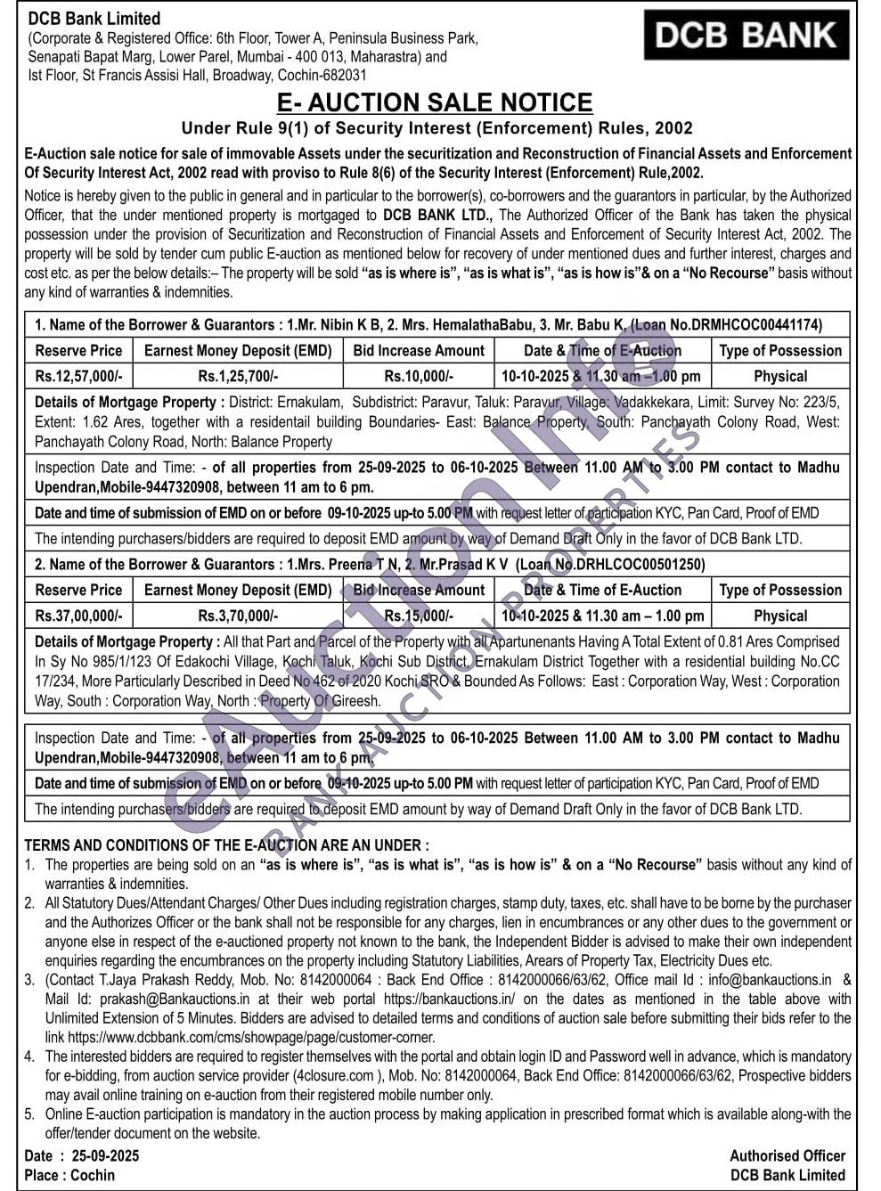 Details of Mortgage Property: All that Part and Parcel of the Property with all Apartunenants Having A Total Extent of 0.81 Ares Comprised In Sy No 985/1/123 Of Edakochi Village, Kochi Taluk, Kochi Sub District, Ernakulam District Together with a residential building No.CC 17/234, More Particularly Described in Deed No 462 of 2020 Kochi SRO & Bounded As Follows: East: Corporation Way, West: Corporation Way, South: Corporation Way, North: Property Of Gireesh.