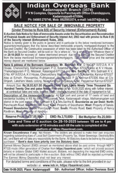Description of the immovable Property: All that part and parcel of 17 cents of land and residential building in RS No.84/135 Payyannur Taluk, Kadannapali village, Mathamangalam sub district in the joint names of Mr.Subhash KV & Mrs.Saritha E. Boundaries as per Deed: North: Panchayath Road, South Private Road: East: Property of Sreedharan; West: Property of Sarala. Present Boundaries: North: Panchayath Road: South: Povale Road: East: Property of Nancy Paviltran, West: Property of Ajesh