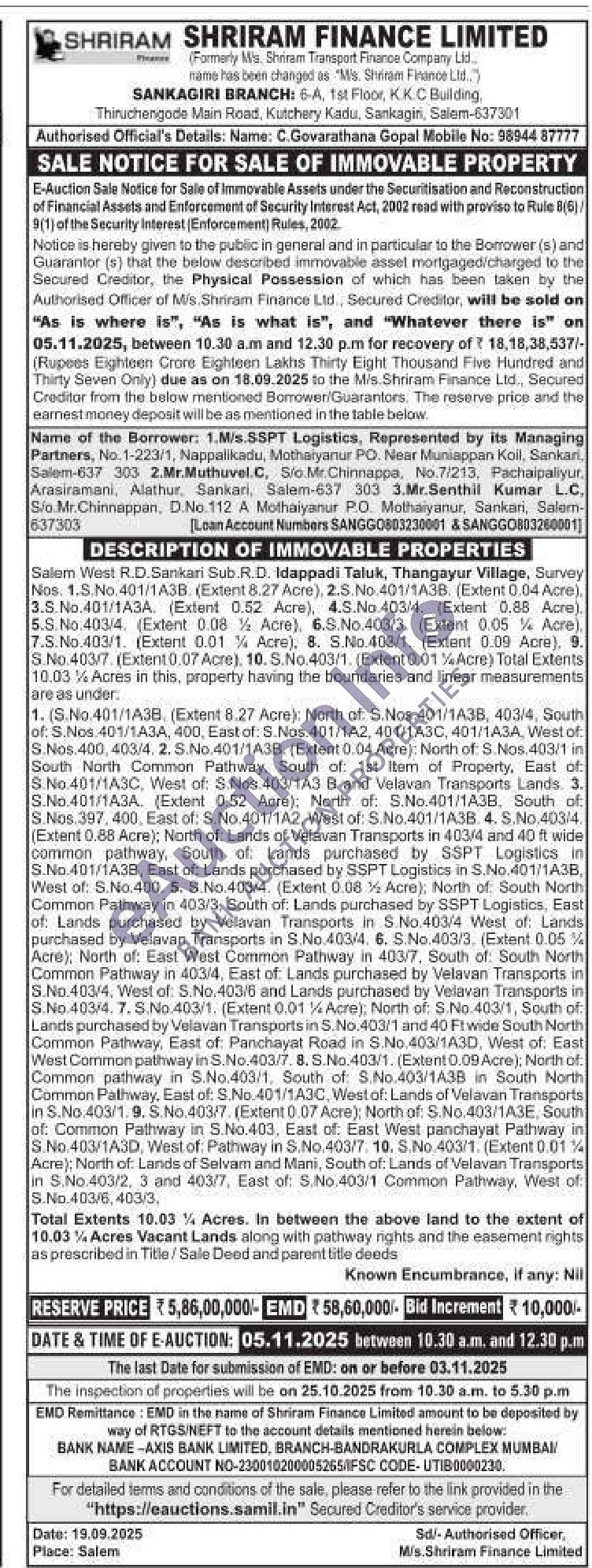 Salem West R.D. Sankari Sub.R. D. Idappadi Taluk, Thangayur Village, Survey Nos. 1.S.No.401/1A3B. (Extent 8.27 Acre), 2.S. No.401/1A3B. (Extent 0.04 Acre) 3.5. No.401/1A3A (Extent 0.52 Acre), 4.5.No.403/4. (Extent 0.88 Acre) 5.S. No.403/4, (Extent 0.08% Acre), 6.S.No.403/3. (Extent 0.05 % Acre 7.S.No.403/1. (Extent 0.01% Acre), 8. S.No.403/1. (Extent 0.09 Acre), 9. S.No.403/7 (Extent 0.07 Acre), 10. S.No.403/1. (Extent 0.01% Acre) Total Extents 10.03% Acres in this, property having the boundaries and linear measurements are as under 1. (S.No.401/1A3B. (Extent 8.27 Acre): North af: S.Nos.401/1A3B, 403/4, South of: S.Nos. 401/1A3A, 400, East of: S.Nos. 401/1A2, 401/1A3C, 401/1A3A, West of S.Nos.400, 403/4. 2. S.No.401/1A3B (Extent 0.04 Acre): North of: S. Nos. 403/1 in South North Common Pathway, South of: 1st Item of Property, East of S.No.401/1A3C, West of: S.Nos 403/1A3 B and Velavan Transports Lands. 3. S.No. 401/1A3A. (Extent 0.52 Acre); North of. S.No.401/1A3B, South of S.Nos 397, 400, East of: S. No.401/1A2, West of: S.No.401/1A3B. 4. S.No.403/4 (Extent 0.88 Acre); North of: Lands of Velavan Transports in 403/4 and 40 ft wide common pathway, South of Lands purchased by SSPT Logistics S.No. 401/1A3B, East of: Lands purchased by SSPT Logistics in S.No.401/1A3B, West of: S.No.400. 5. S.No.403/4 (Extent 0.08% Acre); North of South North Common Pathway in 403/3, South of: Lands purchased by SSPT Logistics, East of: Lands purchased by Velavan Transports in S No.403/4 West of Lands purchased by Velavan Transports in S.No.403/4. 6. S.No.403/3, (Extent 0.05% Acre); North of: East West Common Pathway in 403/7, South of South North Common Pathway in 403/4, East of Lands purchased by Velavan Transports in S.No.403/4, West of. S.No.403/6 and Lands purchased by Velavan Transports S.No.403/4. 7. S.No.403/1. (Extent 0.01% Acre); North of: S.No.403/1, South of Lands purchased by Velavan Transports in S.No. 403/1 and 40 Ft wide South North Common Pathway, East of Panchayat Road in S.No. 403/1A3D, West of. East West Common pathway in S.No.403/7. 8. S.No.403/1. (Extent 0.09 Acre), North of Common pathway in S.No.403/1, South of S.No.403/1A3B in South North Common Pathway, East of: S.No. 401/1A3C, West of: Lands of Velavan Transports in S.No.403/1. 9. S.No. 403/7 (Extent 0.07 Acre): North of: S.No.403/1A3E, South of: Common Pathway in S.No.403. East of. East West panchayat Pathway in S.No.403/1A3D, West of: Pathway in S.No. 403/7. 10. S.No. 403/1. (Extent 0.01% Acre): North of: Lands of Selvam and Mani, South of: Lands of Velavan Transports in S.No.403/2, 3 and 403/7, East of: S.No.403/1 Common Pathway, West of S.No. 403/6,403/3