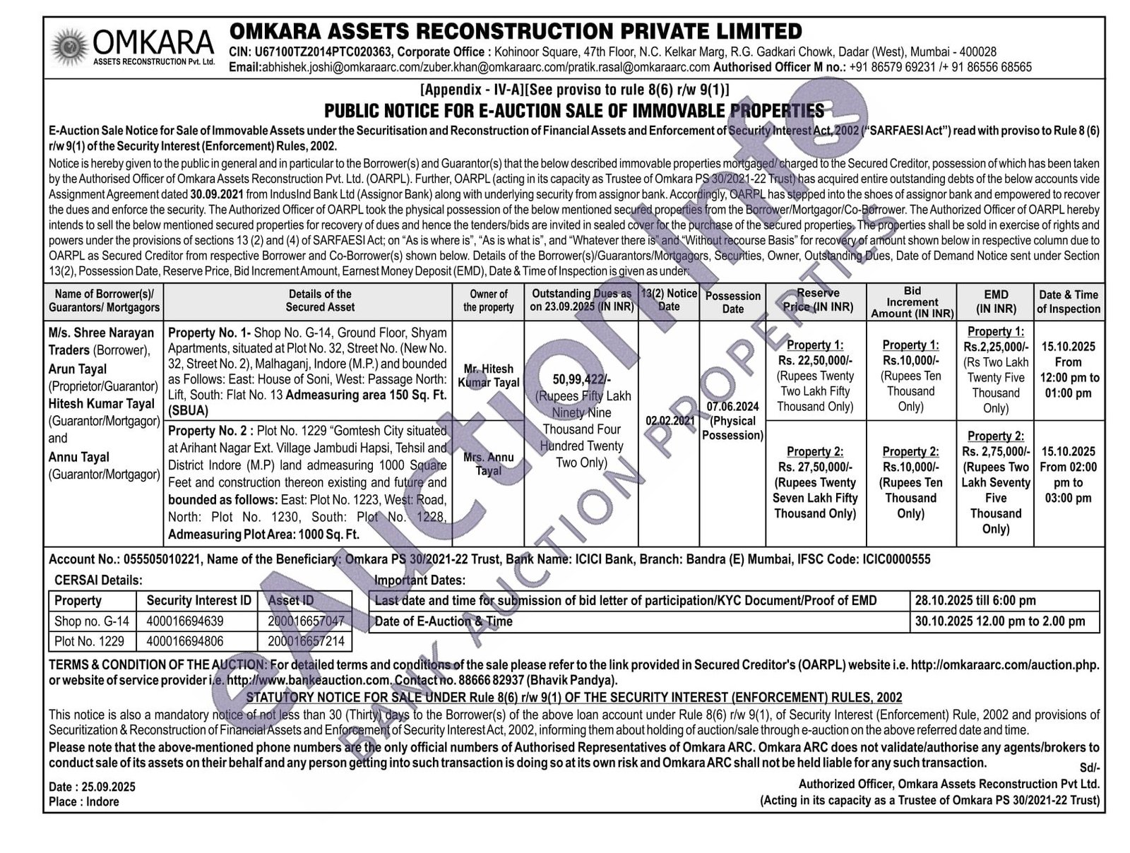 Property No. 1- Shop No. G-14, Ground Floor, Shyam Apartments, situated at Plot No. 32, Street No. (New No. 32, Street No. 2), Malhaganj, Indore (M.P.) and bounded as Follows: East: House of Soni, West: Passage North: Lift, South: Flat No. 13 Admeasuring area 150 Sq. Ft. (SBUA)