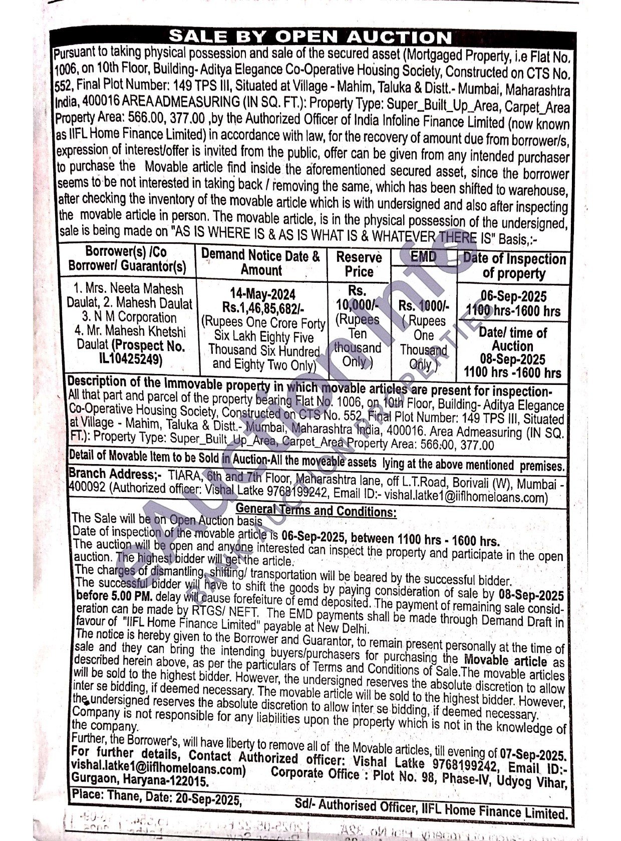 Description of the Immovable property in which movable articles are present for inspection-All that part and parcel of the property bearing Flat No. 1006, on 10th Floor, Building-Aditya Elegance Co-Operative Housing Society, Constructed on CTS No. 552, Final Plot Number: 149 TPS III, Situated at Village Mahim, Taluka & Distt.- Mumbai, Maharashtra India, 400016. Area Admeasuring (IN SQ. FT.): Property Type: Super_Built_Up_Area, Carpet_Area Property Area: 566:00, 377.00