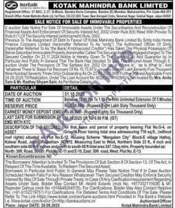 All that piece and parcel of property bearing Flat No.G-4, on ASSET Ground Floor having total arsa admeasuring 710 sq.ft. (without roof rights) situated on Plot NoE-12, Housing Scheme "Mangalam City Block-E village Hathoj Kahwar Road, Jaipur, Rajasthan 302012. Measuring East to West, Northern Side 23 ft, & inch and southem side ft. 9 inches and north to south 60 it total anssa 247 125g mirs. Property bounded as: North: 30ft Road, South: Plot No, E-11 and E-10, East: 30h read, West Plot No. E-13