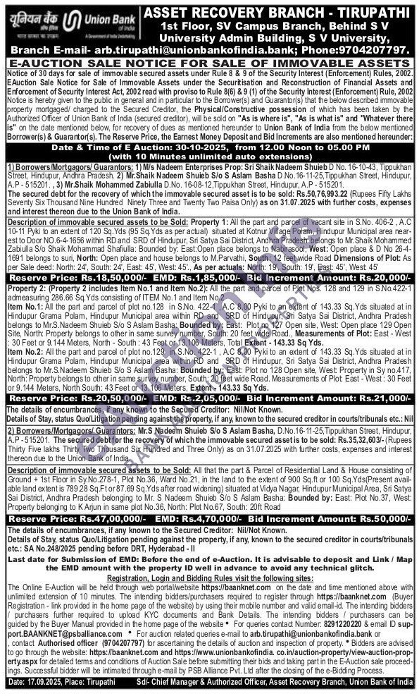 Description of immovable secured assets to be Sold: All that the part & Parcel of Residential Land & House consisting of Ground + 1st Floor in Sy.No.278-1, Plot No.36, Ward No.21, in the land to the extent of 900 Sq.ft or 100 Sq. Yds(Present avail-able land extent is 789.28 Sq. Ftor 87.69 Sq. Yds after road widening) situated at Vidya Nagar, Hindupur Municipal Area, Sri Satya Sai District, Andhra Pradesh belonging to Mr. S Nadeem Shuieb S/o S Aslam Basha: Bounded by: East: Plot No.37, West: Property belonging to K Arjun in same plat No.36, North: Plot No.67, South: 20ft Road