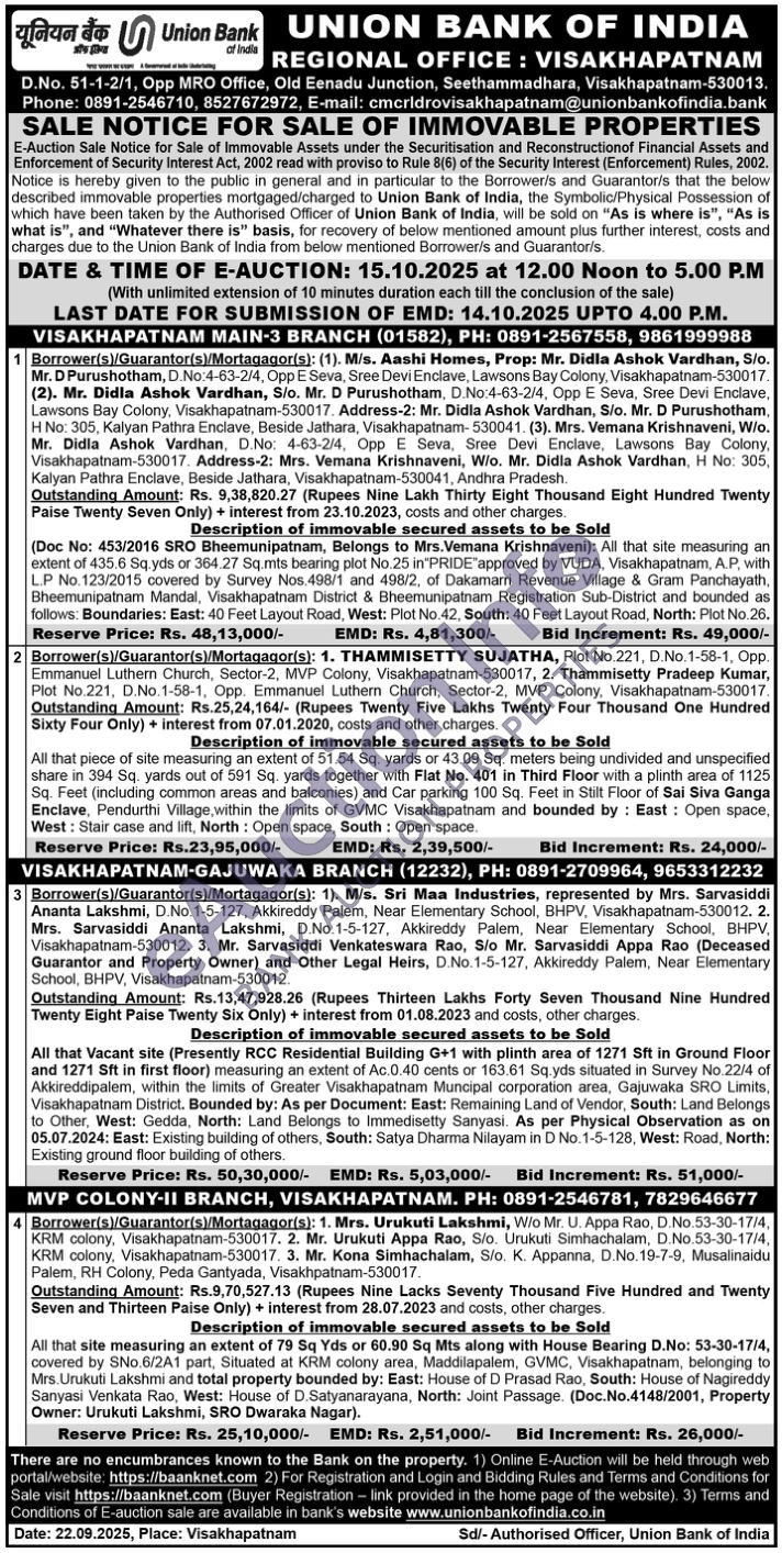 Description of immovable secured assets to be Sold : All that piece of site measuring an extent of 51.54 Sq. yards or 43.09 Sq. meters being undivided and unspecified share in 394 Sq. yards out of 591 Sq. yards together with Flat No. 401 in Third Floor with a plinth area of 1125 Sq. Feet (including common areas and balconies) and Car parking 100 Sq. Feet in Stilt Floor of Sai Siva Ganga Enclave, Pendurthi Village, within the limits of GVMC Visakhapatnam and bounded by: East: Open space, West: Stair case and lift, North: Open space, South: Open space