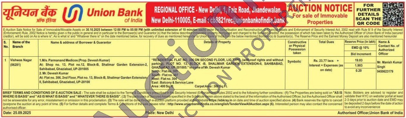 RESIDENTIAL FLAT NO. 306 ON SECOND FLOOR, LIG TYPE, (with roof rights and without parking), PLOT NO. 13, BLOCK B, SHALIMAR SHALI GARDEN EXTENSION-II, SAHIBABAD GHAZIABAD, UP-201005." in name of Mr. Devesh Kumar