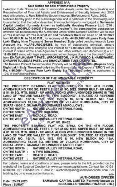 THE PROPERTY BEARING FLAT NO. B/402, ON THE 4TH FLOOR, ADMEASURING 1350 SQ. FEET L. E. 125.41 SQ. MTS. SUPER BUILT-UP AREA, & 81.10 SQ. MTS. BUILT-UP AREA, ALONG WITH UNDIVIDED SHARE IN THE LAND OF "NATURE VALLEY, 'S' TYPE BUILDING, SITUATED AT REVENUE SURVEY NO. 15/1/A, 15/1, 15/2, 15/3 & 16, NEW BLOCK NO. 16/A ADMEASURING 18,920 SQ. METERS OF VILLAGE KUMBHARIA, CITY OF SURAT-395010, GUJARAT. BOUNDARIES AS FOLLOWS: ON THE NORTH: NATURE VALLEY INTERNAL ROAD, ON THE SOUTH A TYPE BUILDING, ON THE EAST ROAD I. C. ROAD, ON THE WEST: NATURE VALLEY INTERNAL ROAD