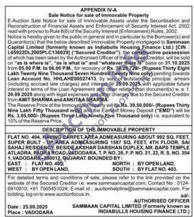 FLAT NO. 404, HAVING CARPET AREA ADMEASURING ABOUT 992 SQ. FEET, SUPER BUILT-UP AREA ADMEASURING 1587 SQ. FEET, 4TH FLOOR, SAI SAHAJ RESIDENCY, BESIDE AKSHAR DARSHAN DUPLEX, NR. BAPS TEMPLE ATLADRA, PADRA ROAD, VADODARA, T. P. NO. 20, F. P. NO. 21, 22, R. S. NO. 354 1, VADODARA-390012, GUJARAT. BOUNDED BY: