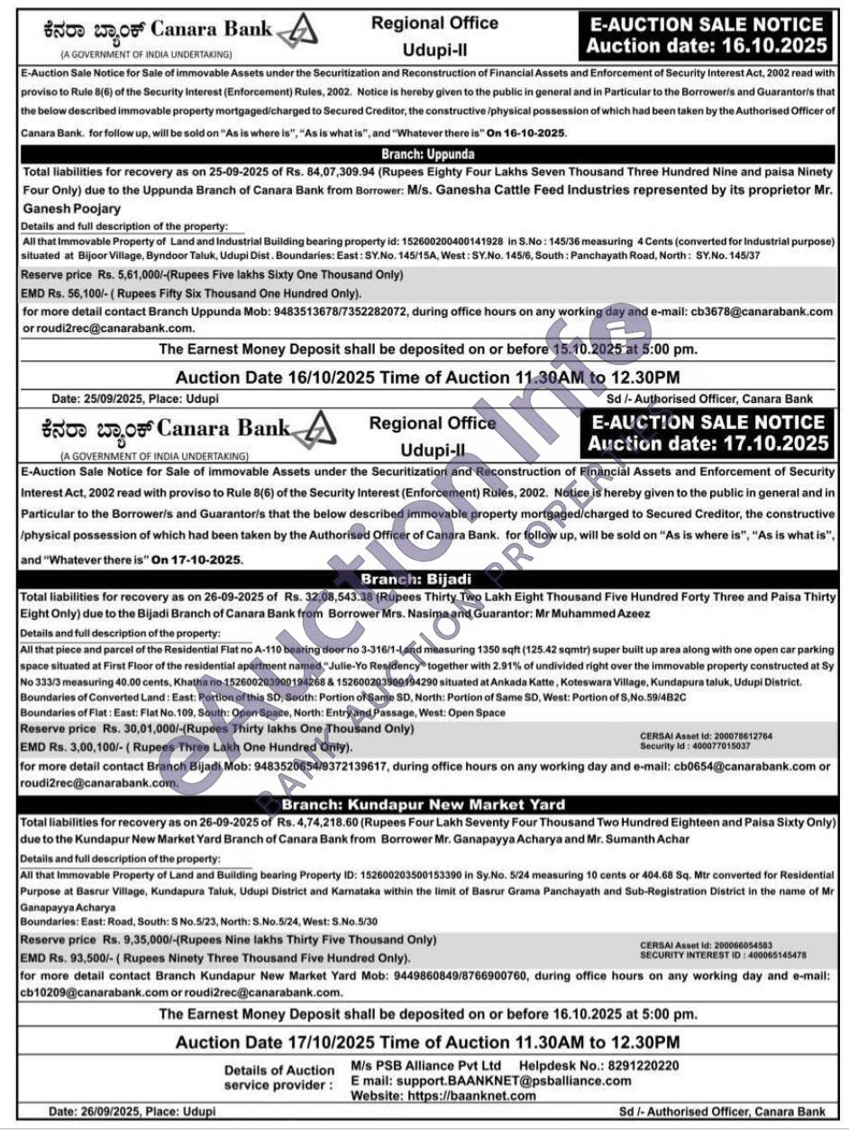 All that Immovable Property of Land and Industrial Building bearing property id: 152600200400141928 in S.No: 145/36 measuring 4 Cents (converted for Industrial purpose) situated at Bijoor Village, Byndoor Taluk, Udupi Dist. Boundaries: East: SY.No. 145/15A, West: SY.No. 145/6, South: Panchayath Road, North: SY.No. 145/37