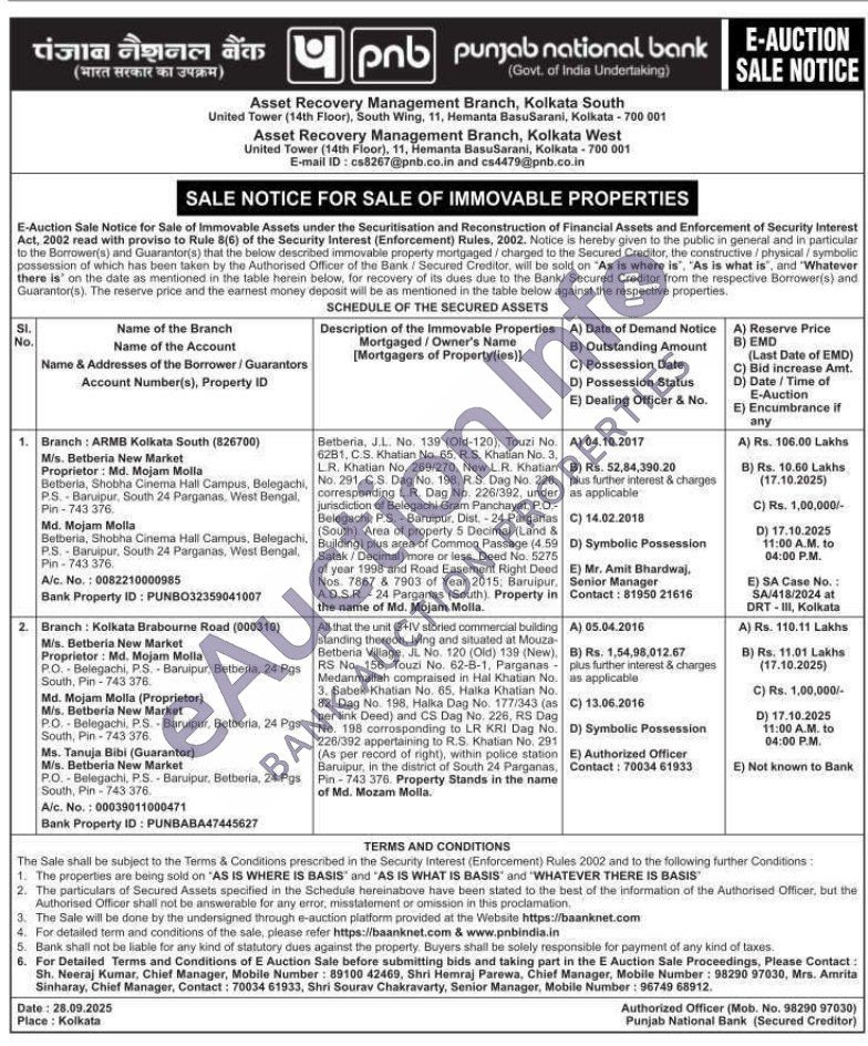 All that the unit G+IV storied commercial building standing thereon, lying and situated at Mouza-Betberia Village, JL. No. 120 (Old) 139 (New), RS No. 156, Touzi No. 62-B-1. Parganas Medanmallah compraised in Hal Khatian No. 3. Sabek Khatian No. 65. Halka Khatian No. 82, Dag No. 198, Halka Dag No. 177/343 (as per link Deed) and CS Dag No. 226, RS Dag No. 198 corrosponding to LR KRI Dag No. 226/392 appertaining to R.S. Khatian No. 291 (As per record of right), within police station Baruipur, in the district of South 24 Parganas, Pin-743 376. Property Stands in the name of Md. Mozam Molla.