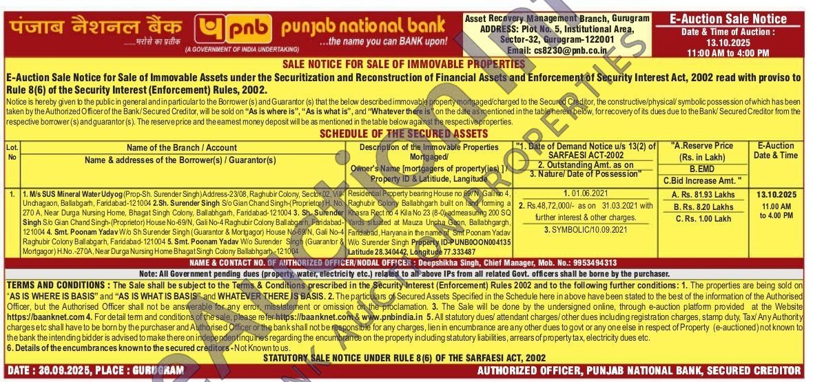 Residential Property bearing House no 69/N, Galino 4, Raghubir Colony Ballabhgarh built on land forming a Khasra Rect no 4 Kila No 23 (8-0) admeasuring 200 SQ Yards situated at Mauza Uncha Gaon, Ballabhgargh, Faridabad, Haryana in the name of Smt Poonam Yadav Raghubir Colony Ballabgarh, Faridabad-121004 5. Smt. Poonam Yadav W/o Surender Singh