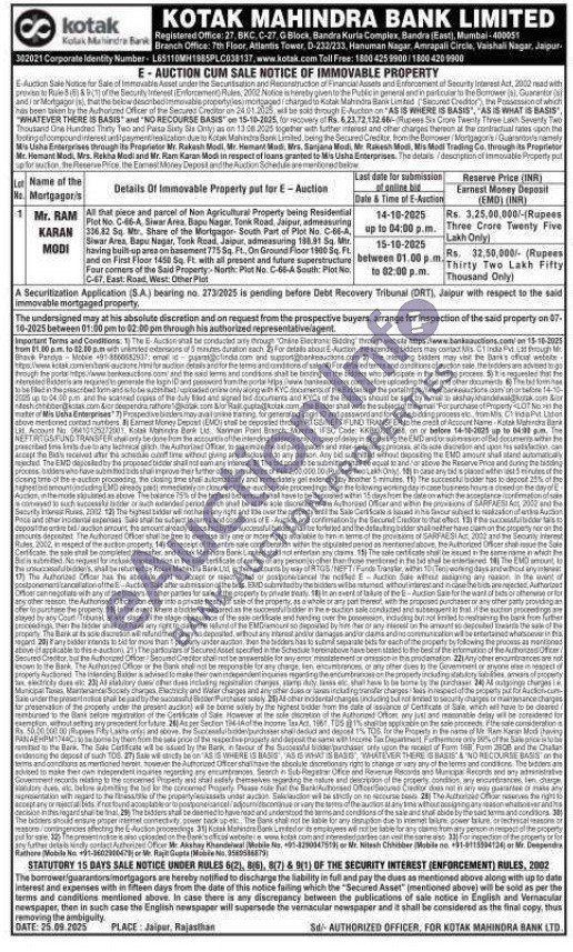 All that piece and parcel of Non Agricultural Property being Residential Plot No. C-66-A, Siwar Area, Bapu Nagar, Tonk Road, Jaipur, admeasuring 336.82 Sq. Mtr. Share of the Mortgagor- Mortgagor- South Part of Plot No. C-66-A, Siwar Area, Bapu Nagar, Tonk Road, Jaipur, admeasuring 188.91 Sq. Mir. having built-up area on basement 775 Sq. Ft., On Ground Floor 1900 Sq. Ft. and on First Floor 1450 Sq. Ft. with all present and future superstructure Four corners of the Said Property: North: Plot No. C-66-A South: Plot No, C-67, East: Road, West: Other Plot