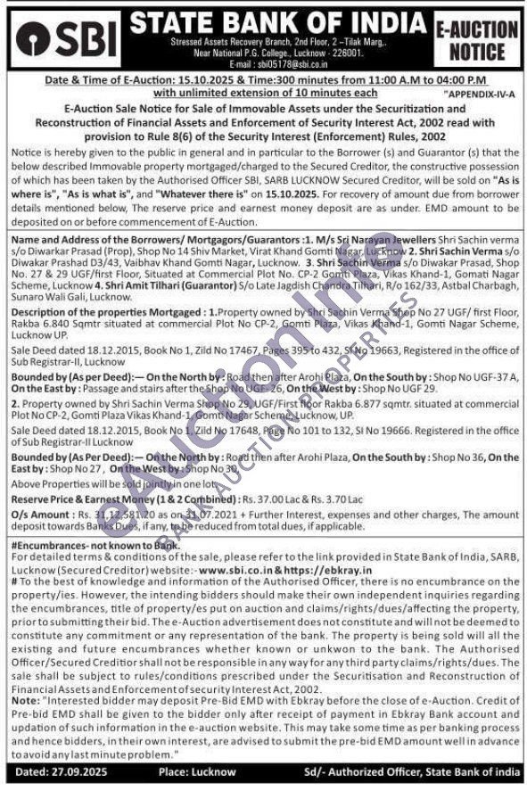 Description of the properties Mortgaged: 1. Property owned by Shri Sachin Verma Shop No 27 UGF/first Floor, Rakba 6.840 Sqmtr situated at commercial Plot No CP-2, Gomti Plaza, Vikas Khand-1, Gomti Nagar Scheme, Lucknow UP. Sale Deed dated 18.12.2015, Book No 1, Zild No 17467, Pages 395 to 432, SI No 19663, Registered in the office of Sub Registrar-II, Lucknow Bounded by (As per Deed):- On the North by: Road then after Arohi Plaza, On the South by: Shop No UGF-37 A, On the East by: Passage and stairs after the Shop No UGF-26, On the West by: Shop No UGF 29